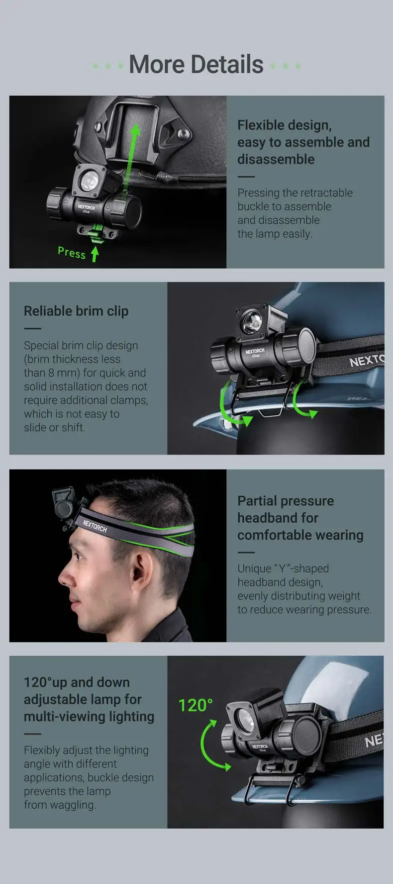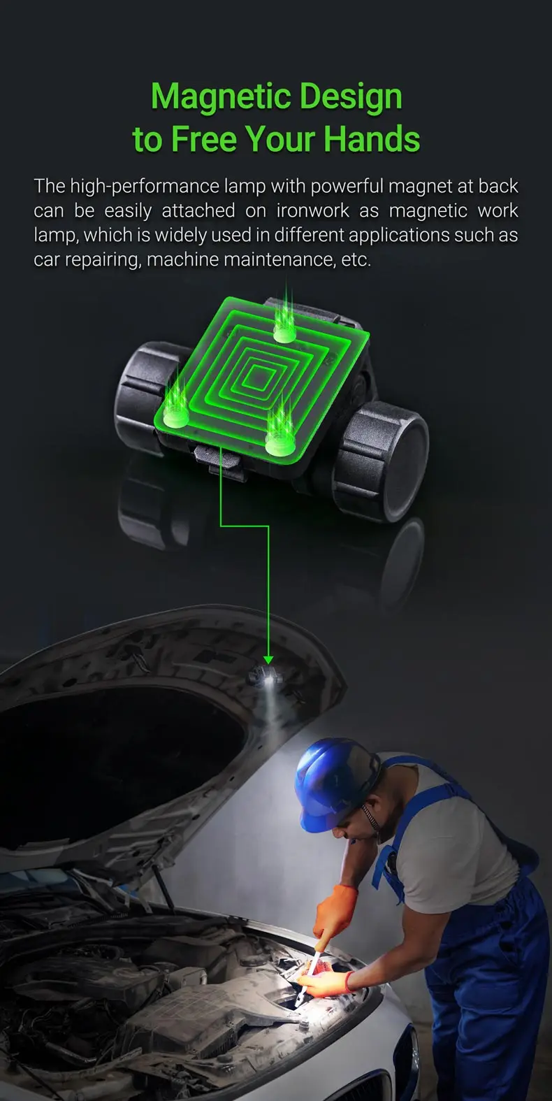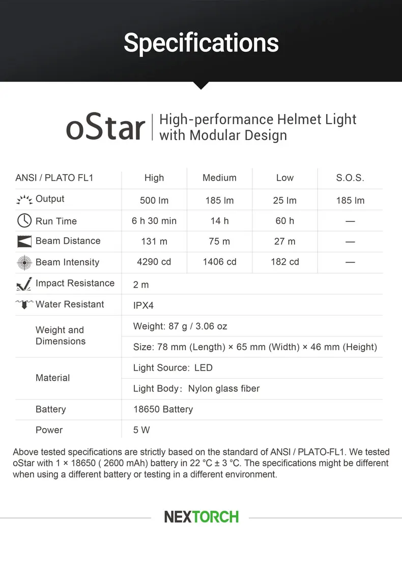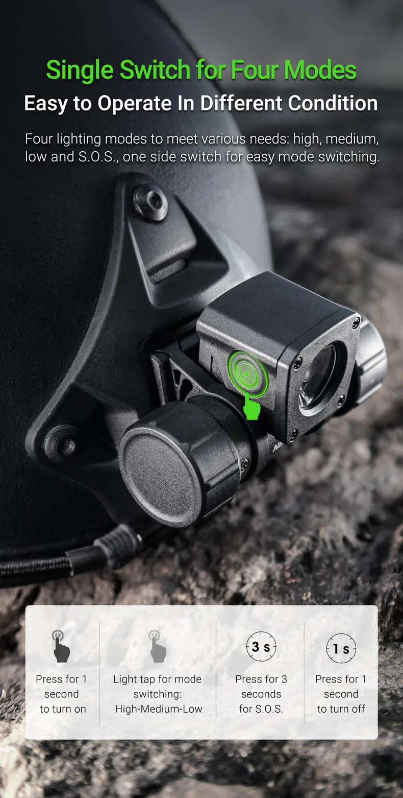 ② OStar se puede montar rápidamente en cascos con interfaz NVG, también se puede fijar en otros tipos de cascos a través de la banda del faro y el soporte del borde, Y se puede adsorber magnéticamente en superficies de metales ferrosos para luces de trabajo de mantenimiento.