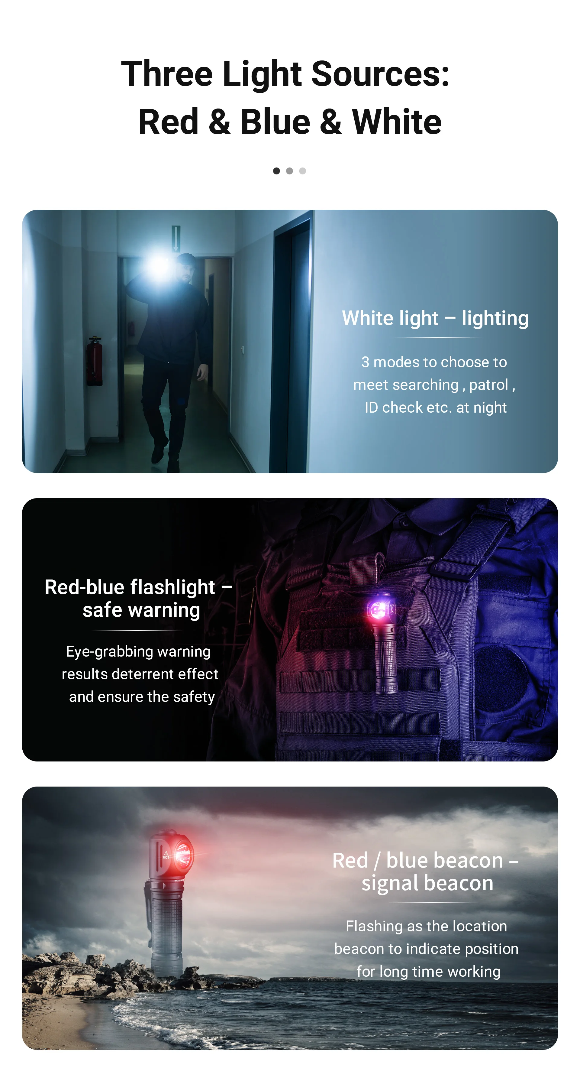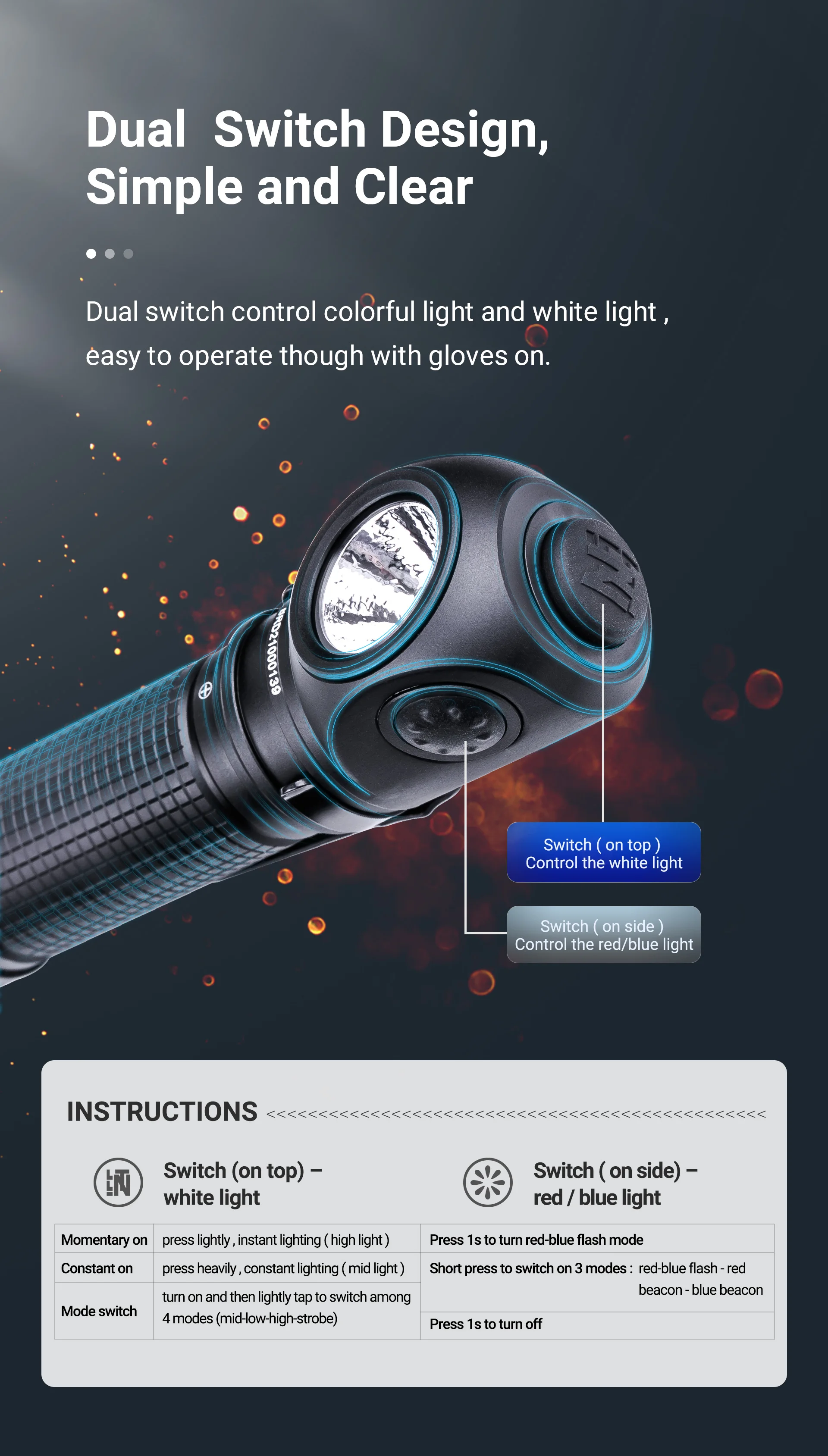 La fuente de luz de 3 colores se puede utilizar en una variedad de escenarios, luz blanca, advertencia de seguridad con flash rojo y azul, farolas rojas y azules para indicar la ubicación;Diseño de interruptor dual, controla respectivamente la luz blanca y la luz de color, lógica de operación simple, fácil de operar incluso con guantes puestos