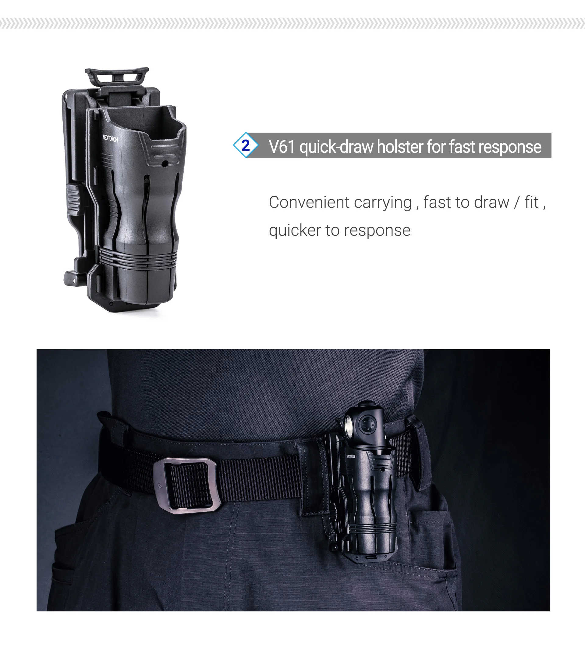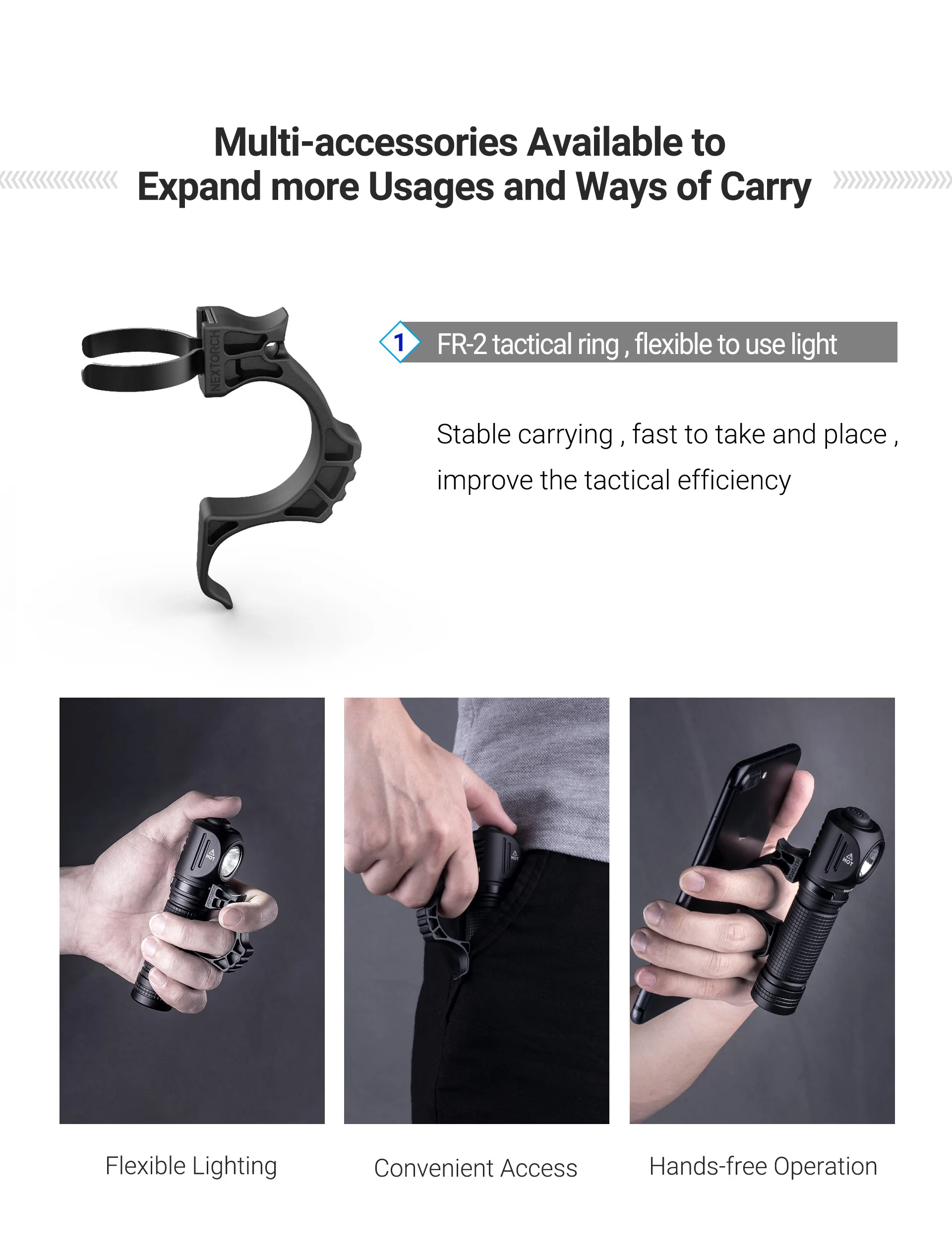 El anillo táctico FR-2 y la funda de extracción rápida V61 son opcionales, no hay necesidad de preocuparse por el problema de levantar y transportar, lo que le permite usar la luz de manera flexible y responder rápidamente.