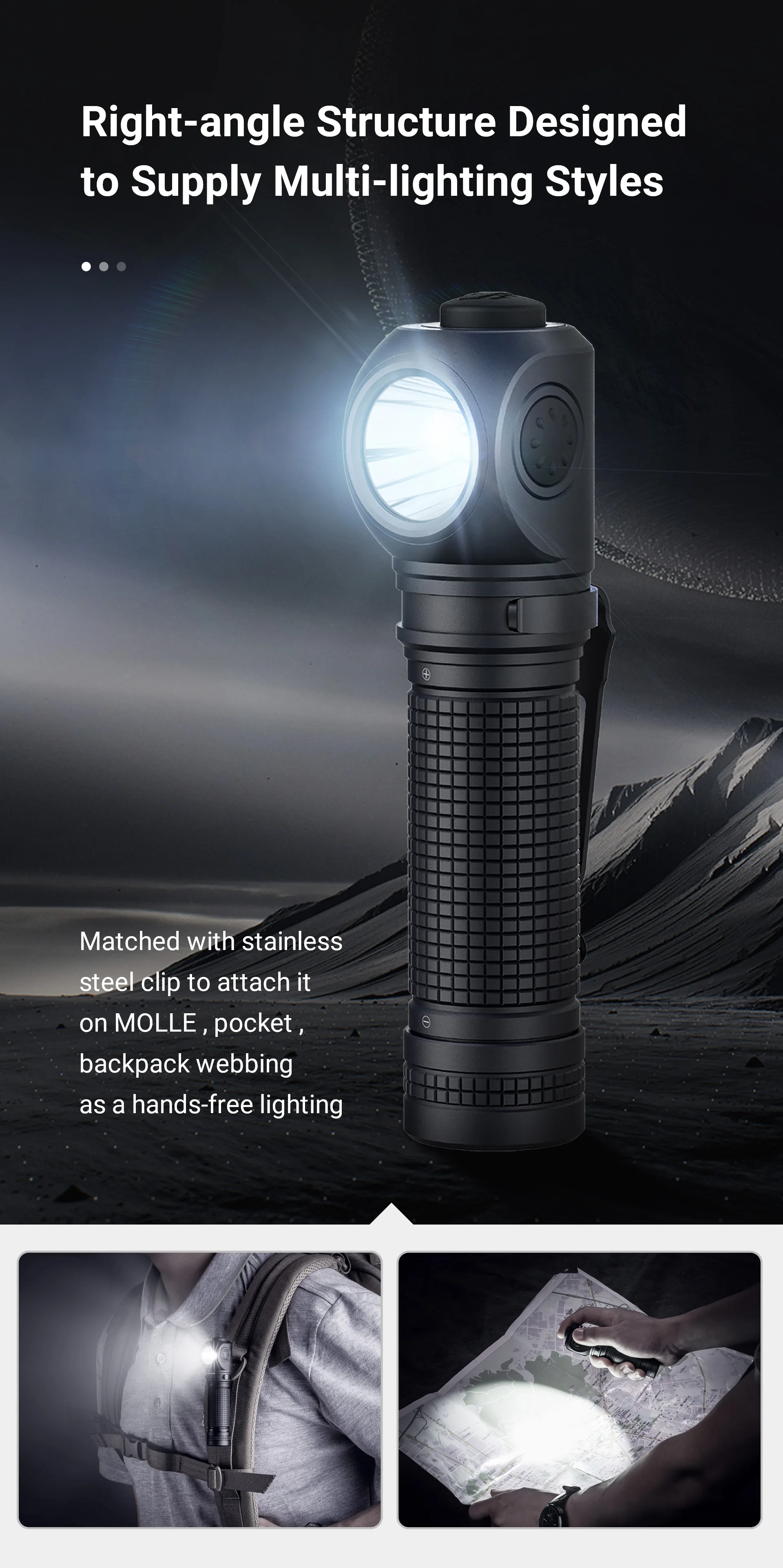 Construcción clásica en ángulo recto con clip de acero inoxidable, fácil de colgar en el pecho (MOLLE, bolsillo, correas de mochila) como iluminación de manos libres, liberando sus manos.