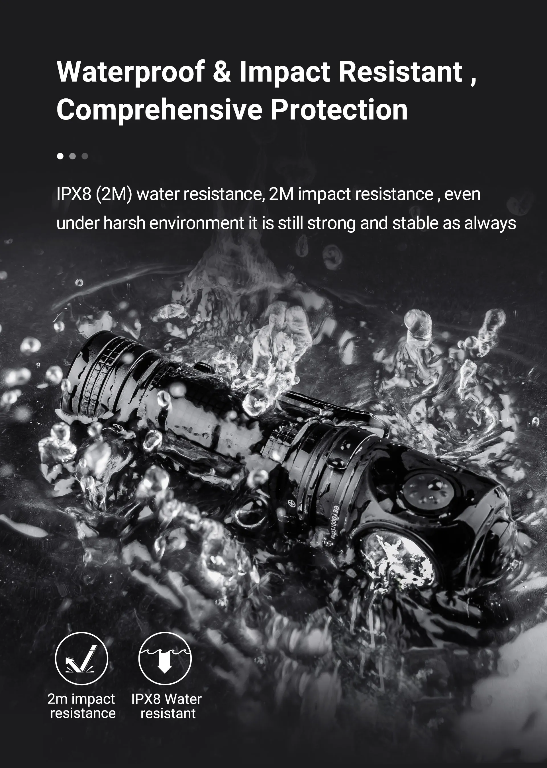 2 metros a prueba de agua y caídas, lo que brinda a la antorcha una protección total.