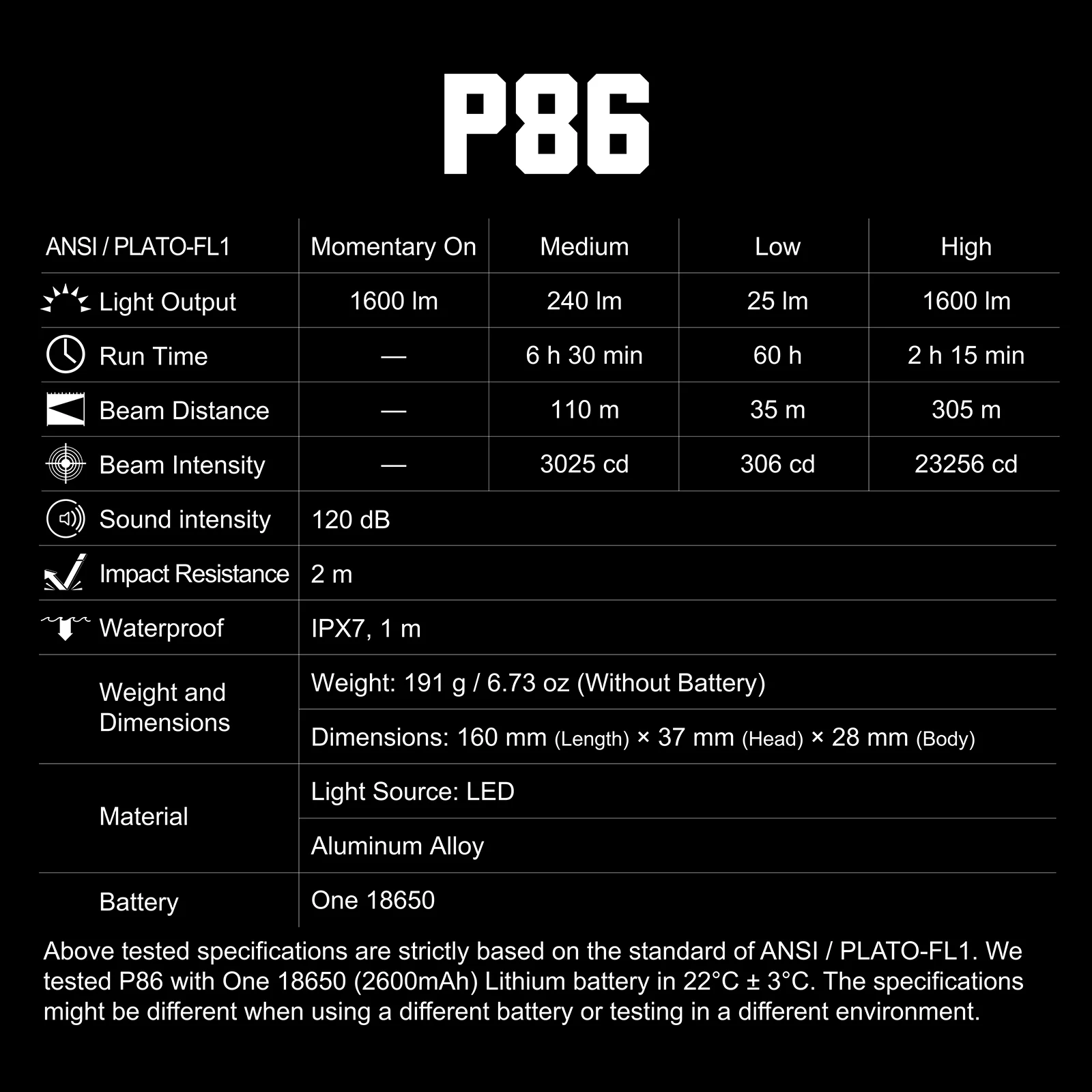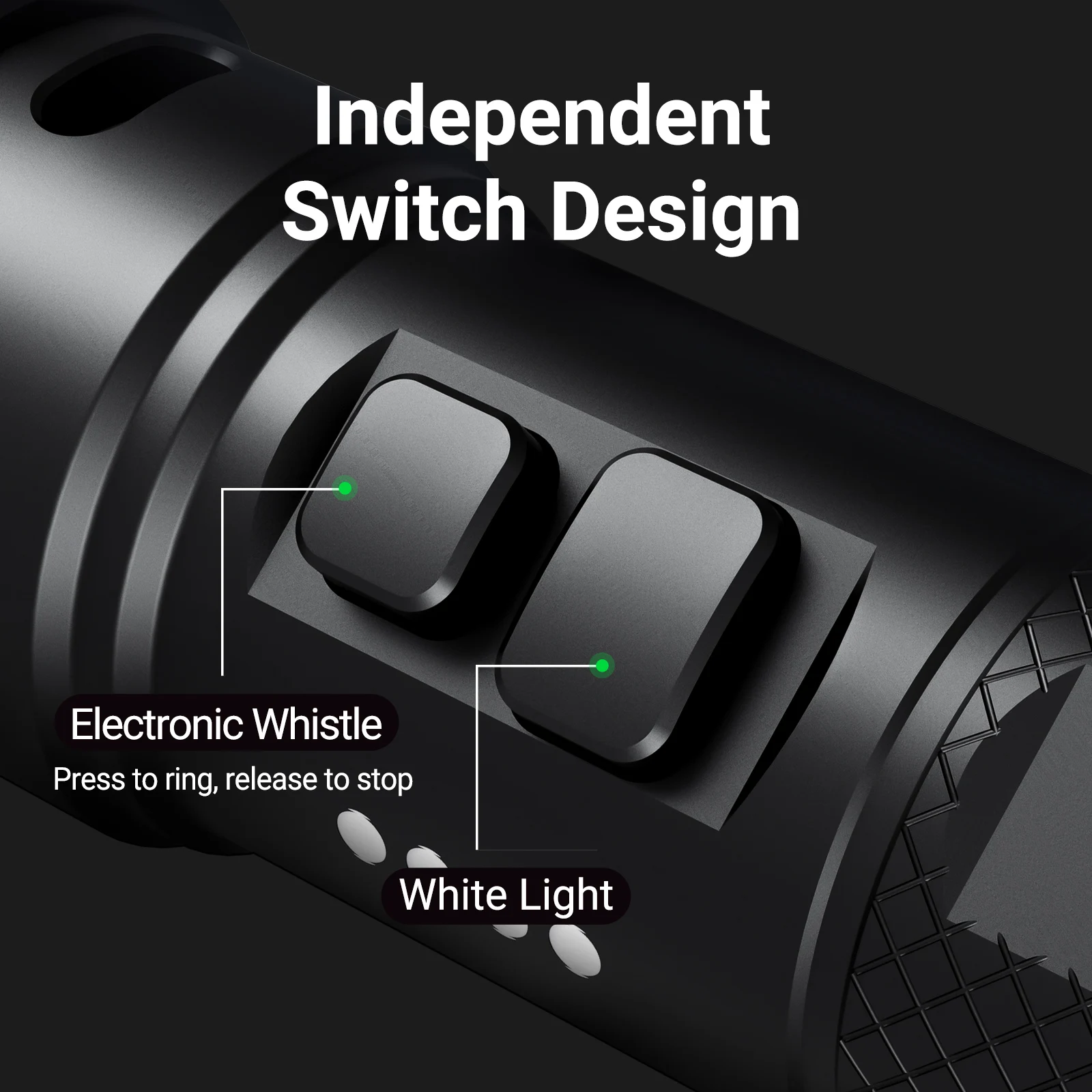 1.P86 proporciona una iluminación clara y brillante y un silbato electrónico de alto decibelio, adecuado para una variedad de escenarios de aplicación.