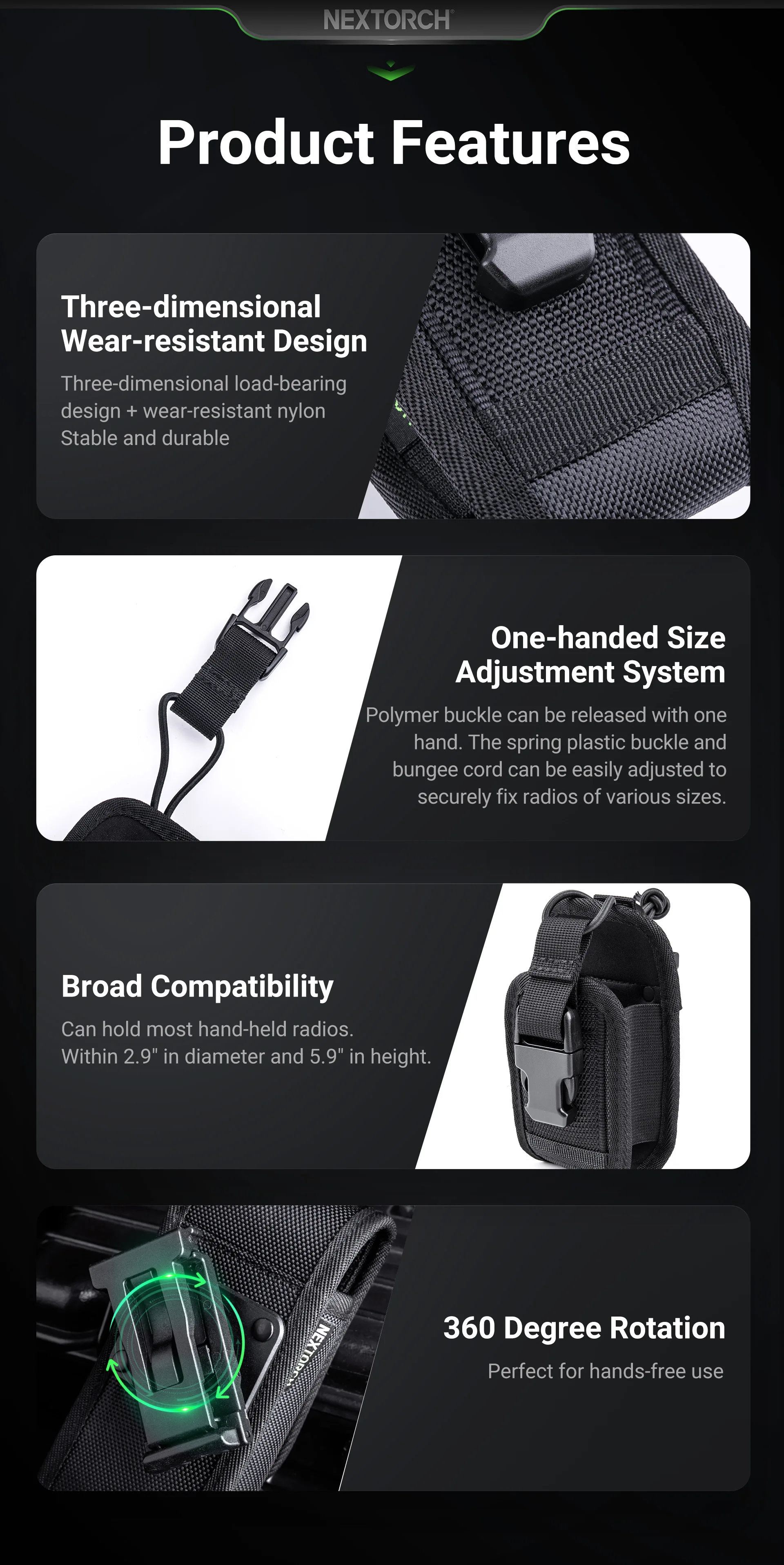 ③ Suitable for walkie-talkies with a diameter of 75 mm and a length of less than 150 mm. It has a 360-degree rotation design and can be adjusted at will.