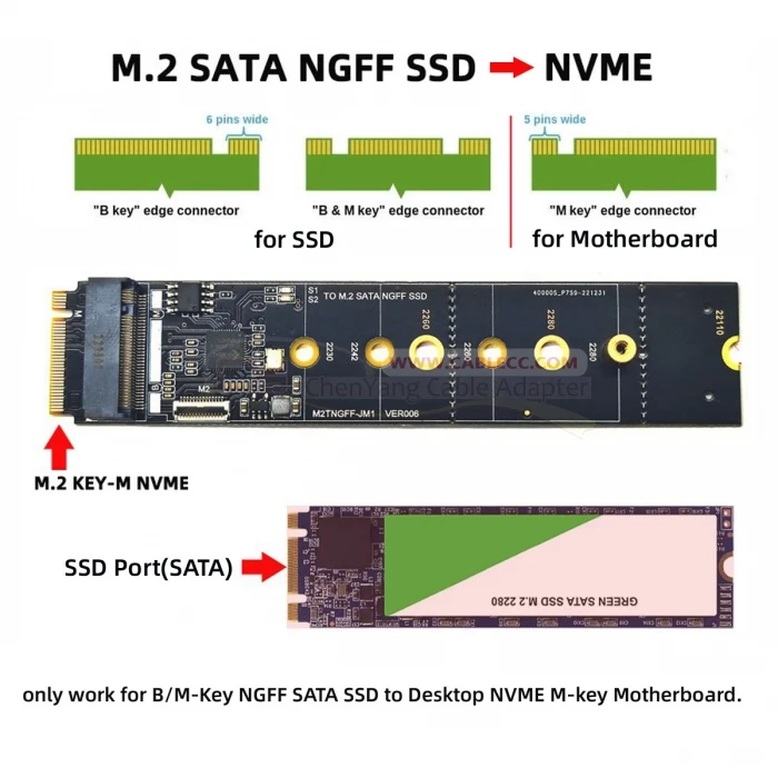 SATA NGFF Key B + M SSD a NVME M-key Placa base Adaptador de escritorio Convertidor Tarjeta SSD JMB582 2280