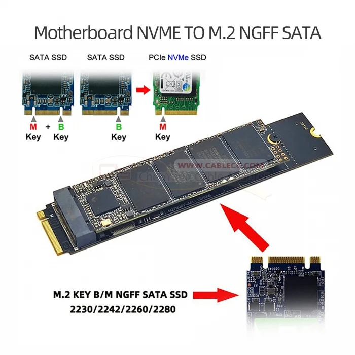 Supoort SATA NGFF Key B + M SSD con 2230/2242/2260/2280.