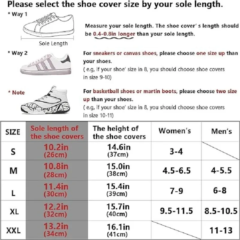 Reutilizable- ¡Llévalos contigo!Ligeros, plegables, fáciles de transportar y flexibles para guardar en su bolso o bolsillo.¡Prepárate para una lluvia inesperada!Talla - Media - se adapta a una talla de zapato 40-42 (hombres estadounidenses 7,5-8,5 - mujeres estadounidenses 9,5-10.5).La longitud de la funda del zapato es: 30 cm.¡Importante!Para saber la talla que necesitas, mide la longitud de tu zapato, luego elige la talla de cubrezapatos que sea mayor que tu zapato.