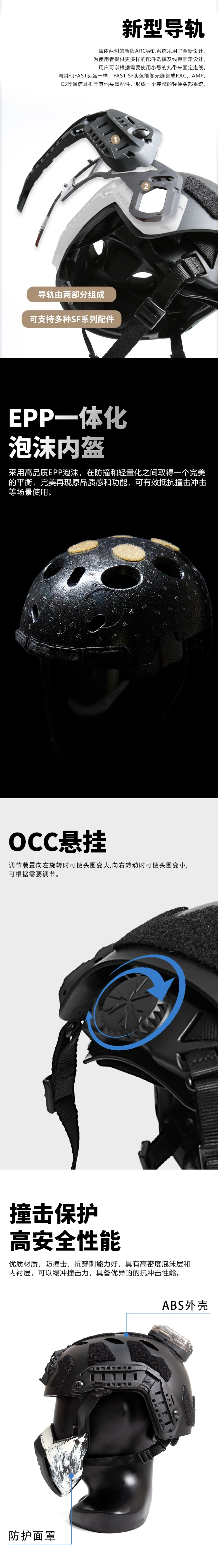 El sistema de riel guía ARC en ambos lados del casco adopta un nuevo diseño, brindando a los usuarios una selección más diversificada de accesorios y diseño de fijación de mazos de cables.Los usuarios pueden colocar pequeñas correas según sea necesario (se deben comprar por separado) para asegurar el cableado.Como otros cascos FAST, los cascos FAST SF pueden integrarse perfectamente con otros accesorios para cascos como los auriculares de comunicación RAC, AMP, C3 (se deben comprar por separado), formando un sistema completo de protección para los sombreros liviano.Además, para quienes tienen necesidades de protección ocular, también se proporcionan gafas antivaho tipo split, que combinan perfectamente con el sistema de riel ARC del casco.