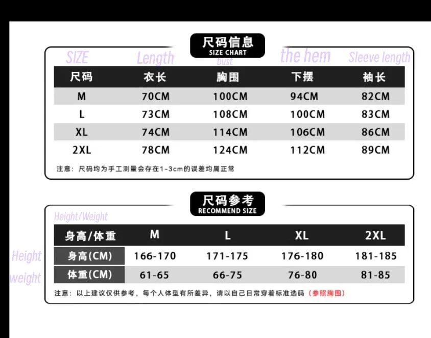 2XL: Suitable for height 181-185cm, weight 81-85kg
