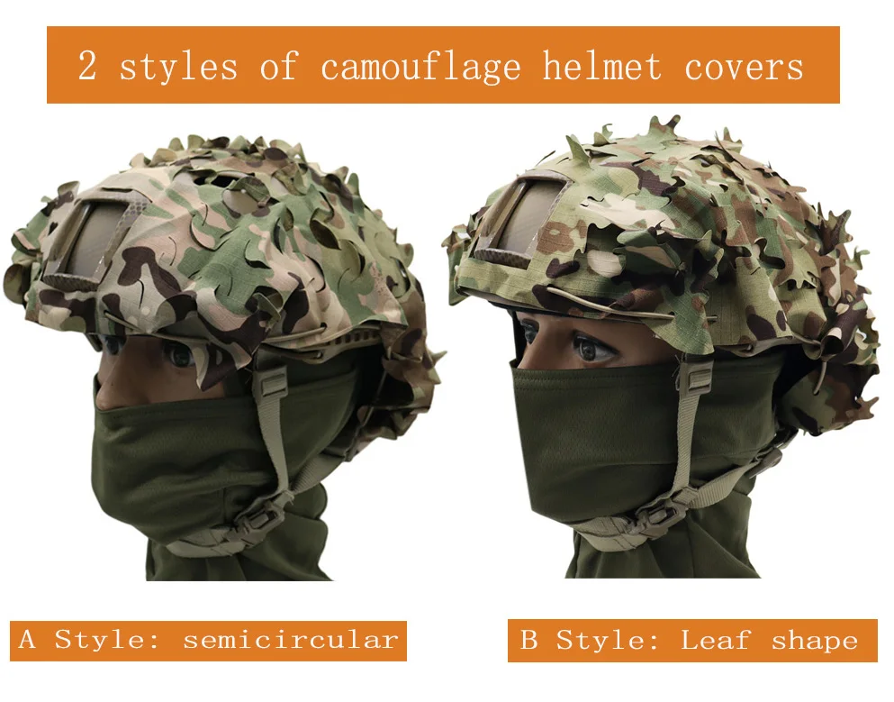 2 estilos de fundas de casco de camuflaje: Estilo A - Semicircular, Estilo B - Hoja
