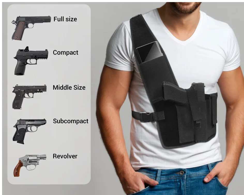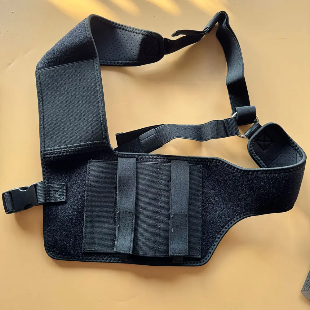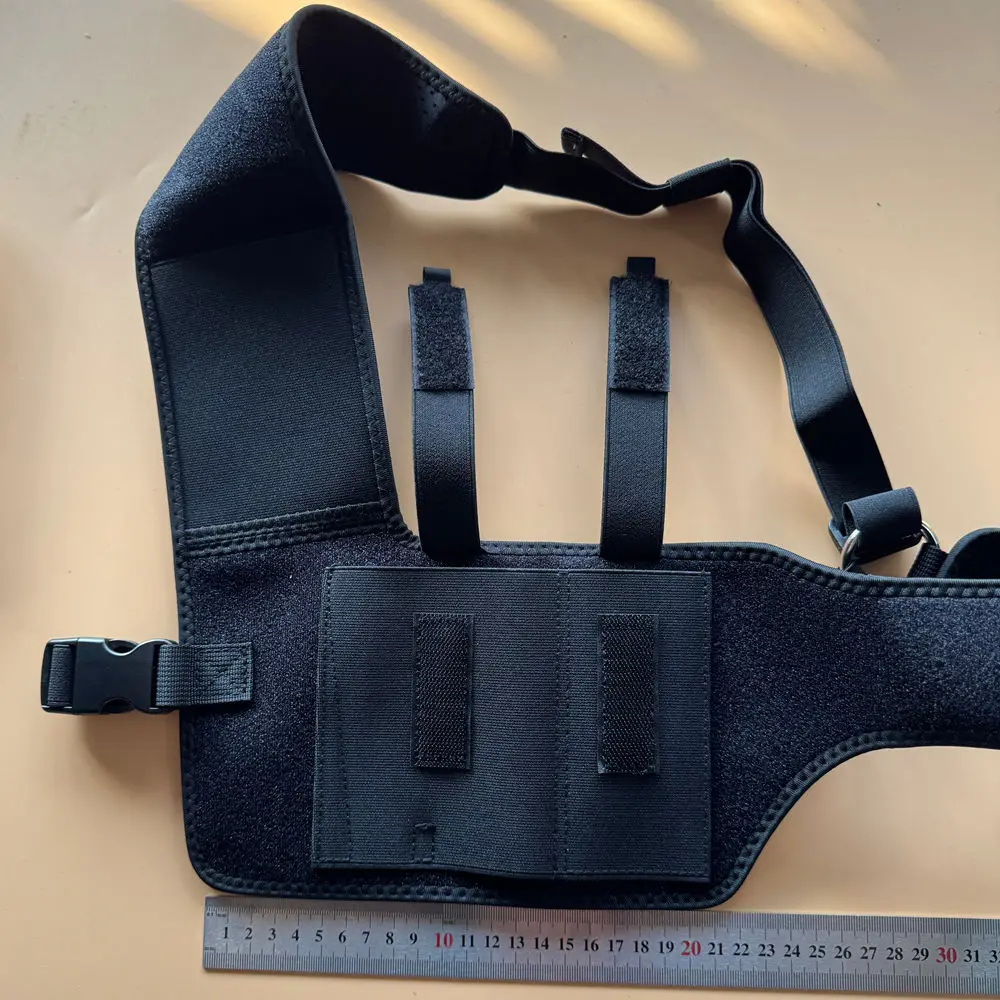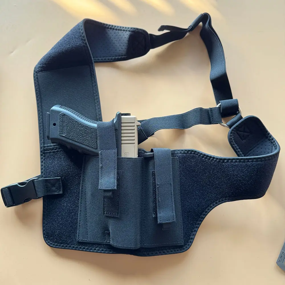 2. La funda de transporte oculta está hecha de neopreno cómodo, es ligera y transpirable.El diseño más amplio permite transportar bien la pistola, la cabeza de la pistola no quedará expuesto, lo cual es más seguro y la correa mantiene las pistolas cerca del cuerpo para ocultar bien.Puedes usarlo debajo de una chaqueta o chaleco de cuero.