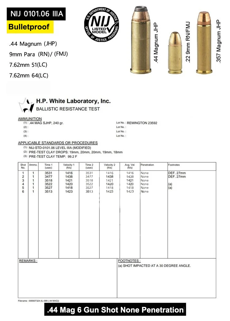 Defense class: NIJ IIIA, against 9mm FMJ, .44 Magnum JHP and lower bullets;
