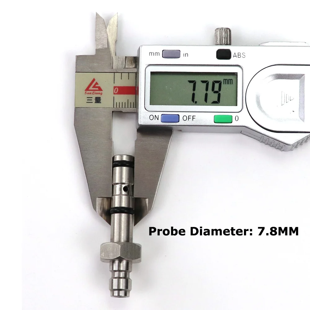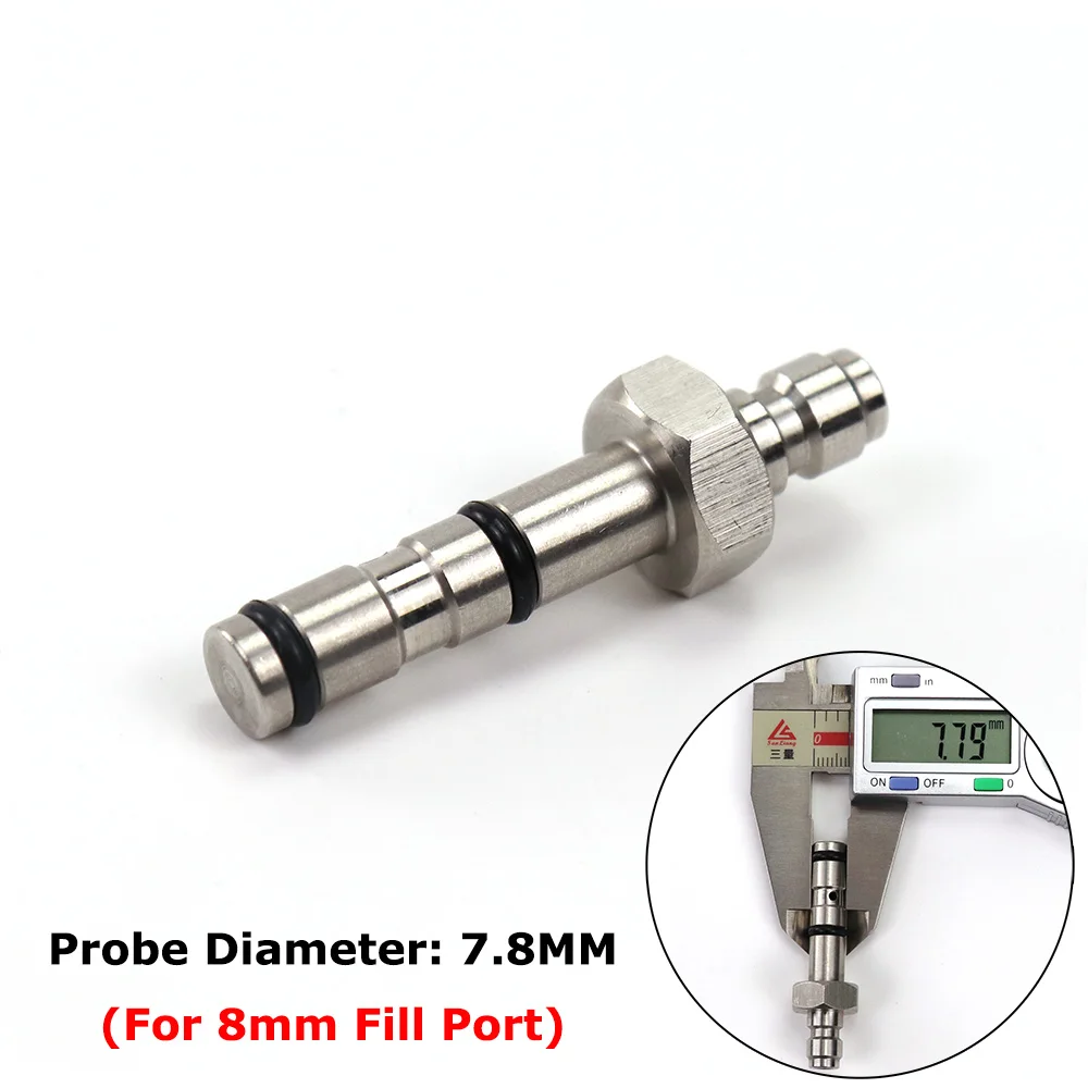 Diámetro de la sonda: 8,8mm-para Puerto de llenado de 9mm y 7,8mm-para Puerto de llenado de 9mm. (NOTA: Hay dos tamaños diferentes de puerto de llenado de aire que Hatsan utiliza en todos sus diversos modelos/calibres. Algunos tienen el puerto de llenado de 8mm de diámetro, mientras que otros tienen el puerto de llenado de 9mm de diámetro. Compruebe rápidamente el diámetro exterior de su puerto de llenado antes de la compra.