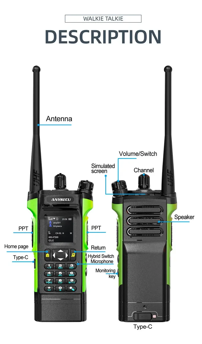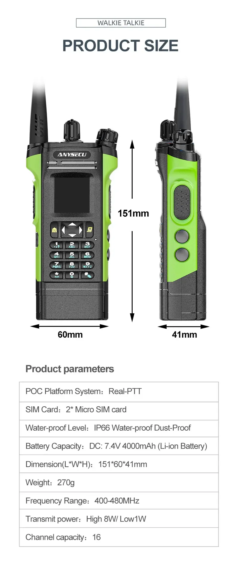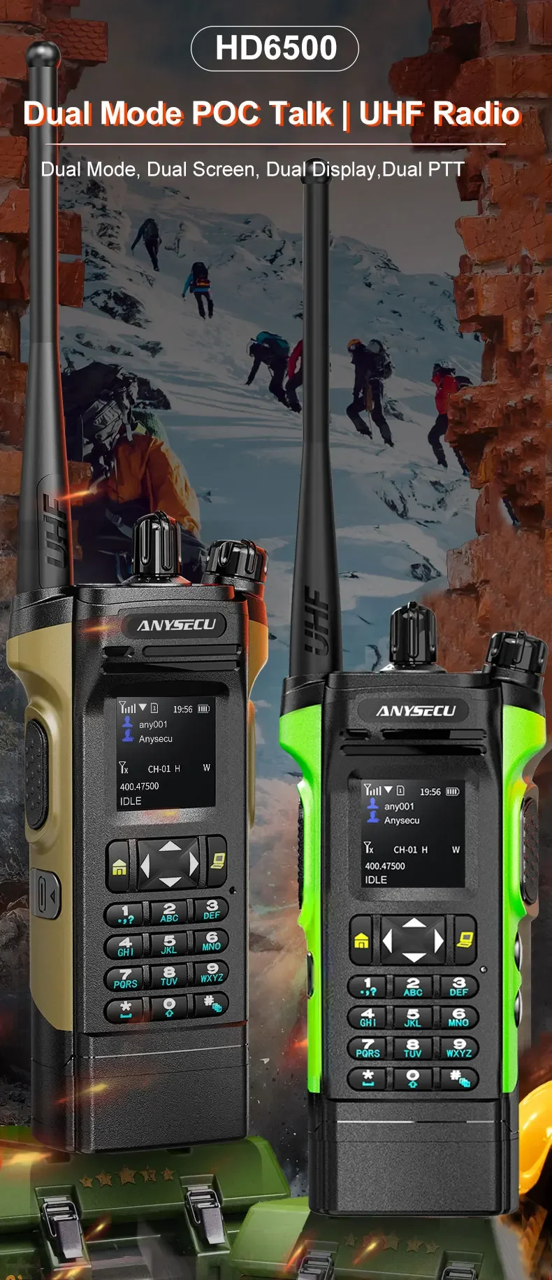 Product DescriptionAbout 4G-HD6500 RadioDual Mode, Dual Screen, Dual Display,Dual PTT POC Mode: Radio Support Real PTT platform UHF Mode: Support UHF Analog Radio 400-470MHz Main Features POC partAnalog part*4G//WCDMA/GSM network *UHF Analog Radio *GPS Location *High/Low Power *Unlimited Groups *Wide/Narrow band *Unlimited Members *Keypad lock *Unlimited Friends *50 CTCSS & 105 DCS *Phone Call function *0-10 Squelch *Individual Call /Group Call/All Call *Battery Save *English Voice Prompt *TOT/ANI ID/Scan/VOX General SpecificationFrequency Band "LET-FDD:B1/B3/B5/B8 LET-TDD:B34/B3B/B39/B40/B41" POC Platform System Real-PTT SIM Card 2* Micro SIM card Water-proof Level IP66 Water-proof Dust-Proof Battery Capacity DC: 7.4V 4000mAh (Li-ion Battery) Dimension(L*W*H) 151*60*41mm Weight 270g Analog partFrequency Range 400-480MHz Transmit power High 8W/ Low1W Channel capacity 16 Channel spacing 12.5KHz/25kHz Antenna impedance 50Ω Operating temperature -20℃ ~ +60℃ Frequency stability +/-2.5ppm Rated audio power 1000mW Modulation distortion ≤5% Standard PackageRadio *1 Battery *1 Antenna *1 USB Adaptor *1 USB Cable *1 Belt Clip *1