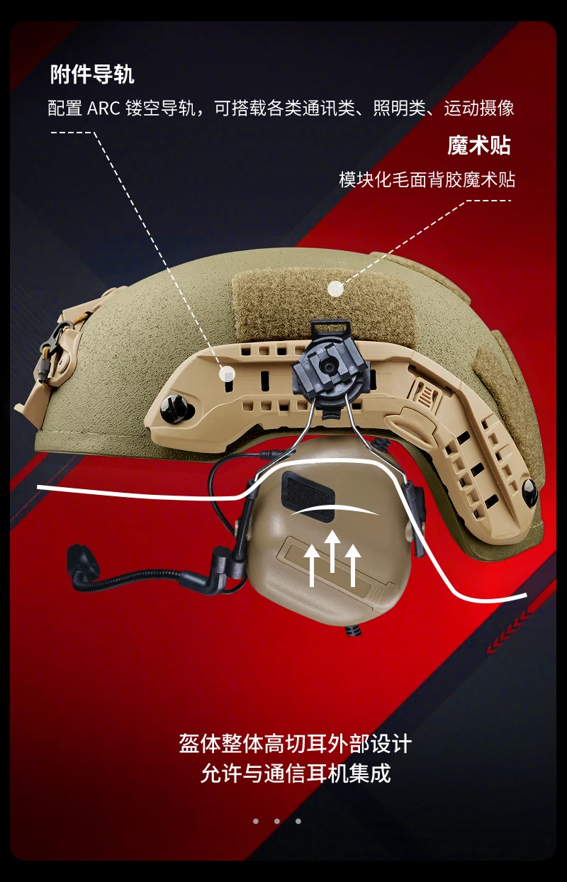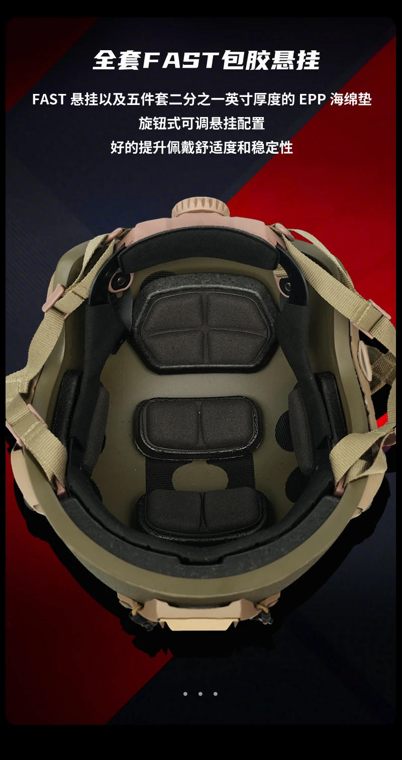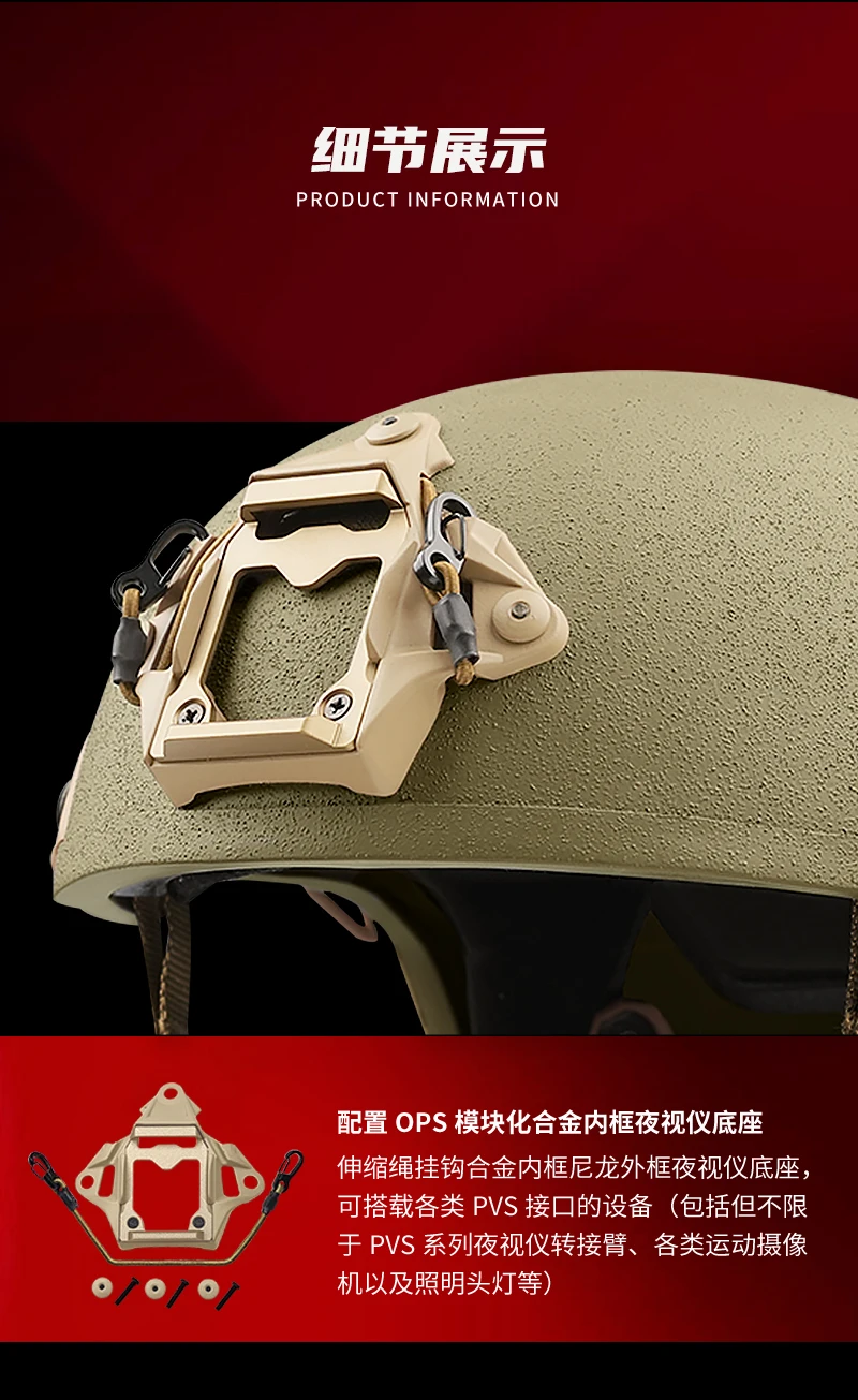 Configuración externa del casco: la parte delantera está equipada con un gancho de cuerda telescópico modular OPS, un marco interior de aleación, un marco exterior de nailon y una base para dispositivo de visión nocturna.Puede transportar varios dispositivos de interfaz PVS (incluidos, entre otros, los brazos adaptadores de dispositivos de visión nocturna de la serie PVS, varias cámaras de acción y faros para iluminación, etc.)