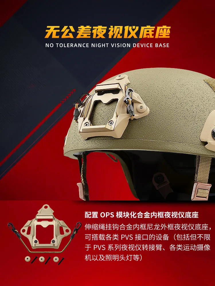 Configuración externa del casco: la parte delantera está equipada con un gancho de cuerda telescópico modular OPS, un marco interior de aleación, un marco exterior de nailon y una base para dispositivo de visión nocturna.Puede transportar varios dispositivos de interfaz PVS (incluidos, entre otros, los brazos adaptadores de dispositivos de visión nocturna de la serie PVS, varias cámaras de acción y faros para iluminación, etc.)