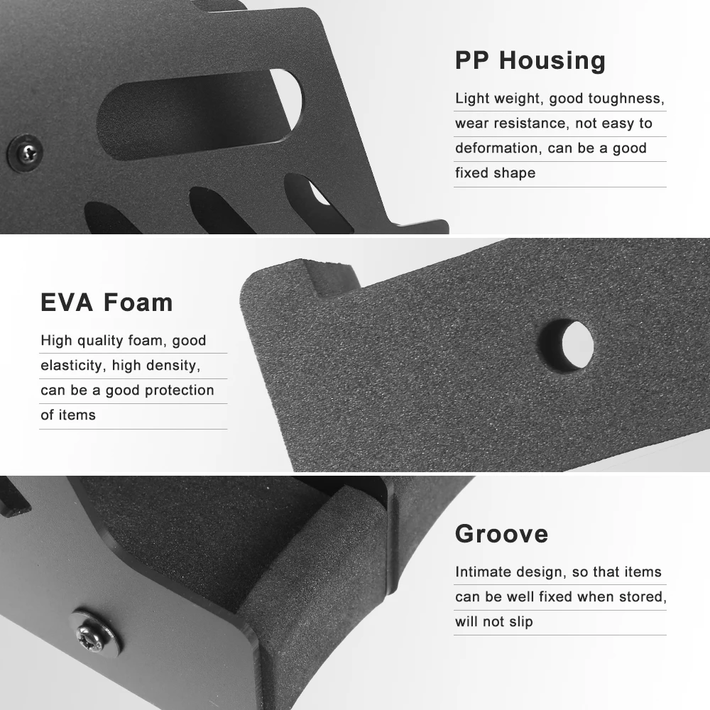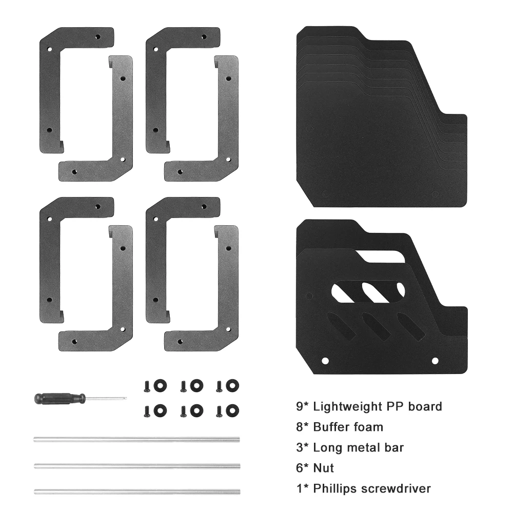 8Slots: 9 x lightweight PP board, 8 x buffer foam, 3 x long metal rod, 6 x nuts, 1 x phillips screwdriver