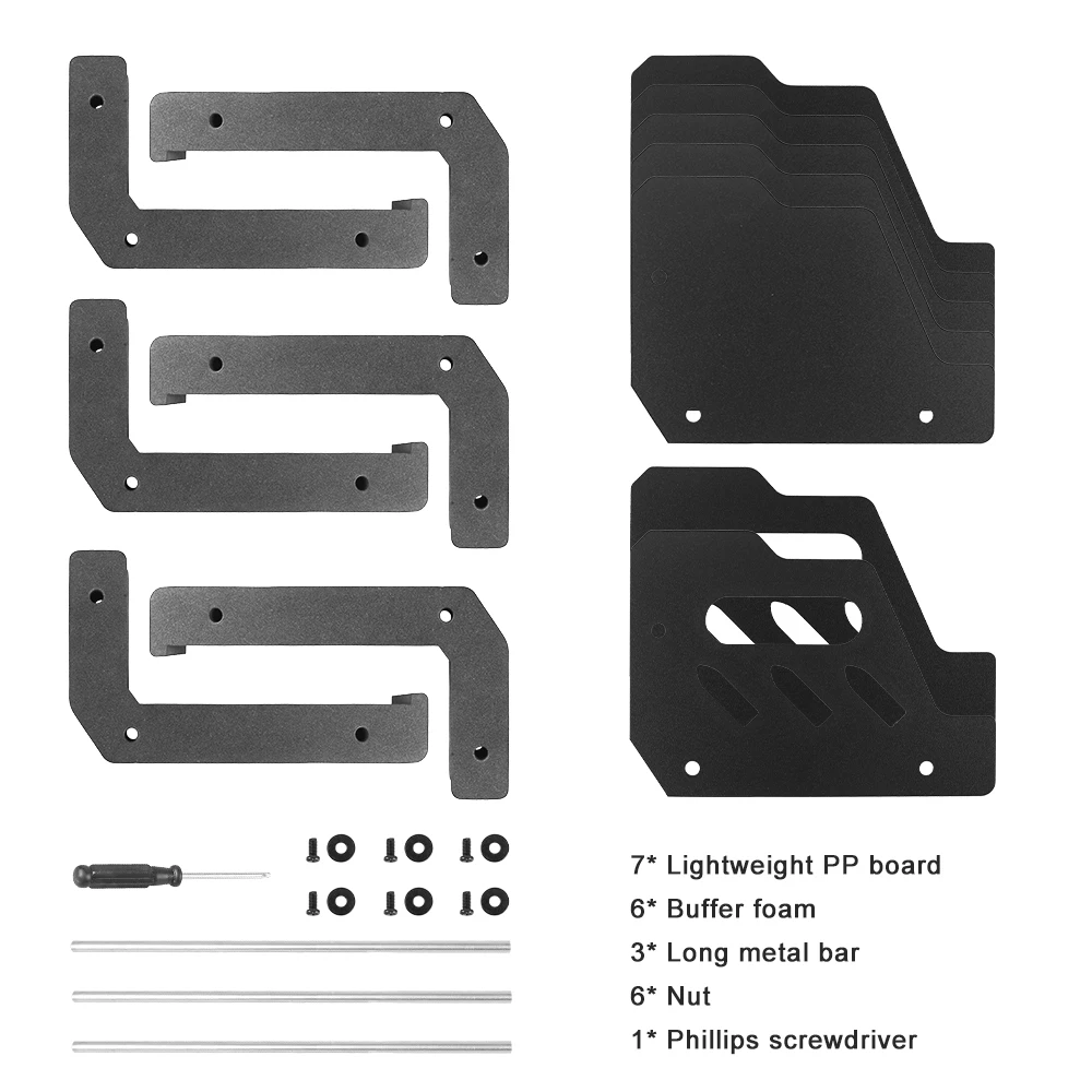 6Slots: 7 x lightweight PP board, 6 x buffer foam, 3 x long metal rod, 6 x nuts, 1 x phillips screwdriver