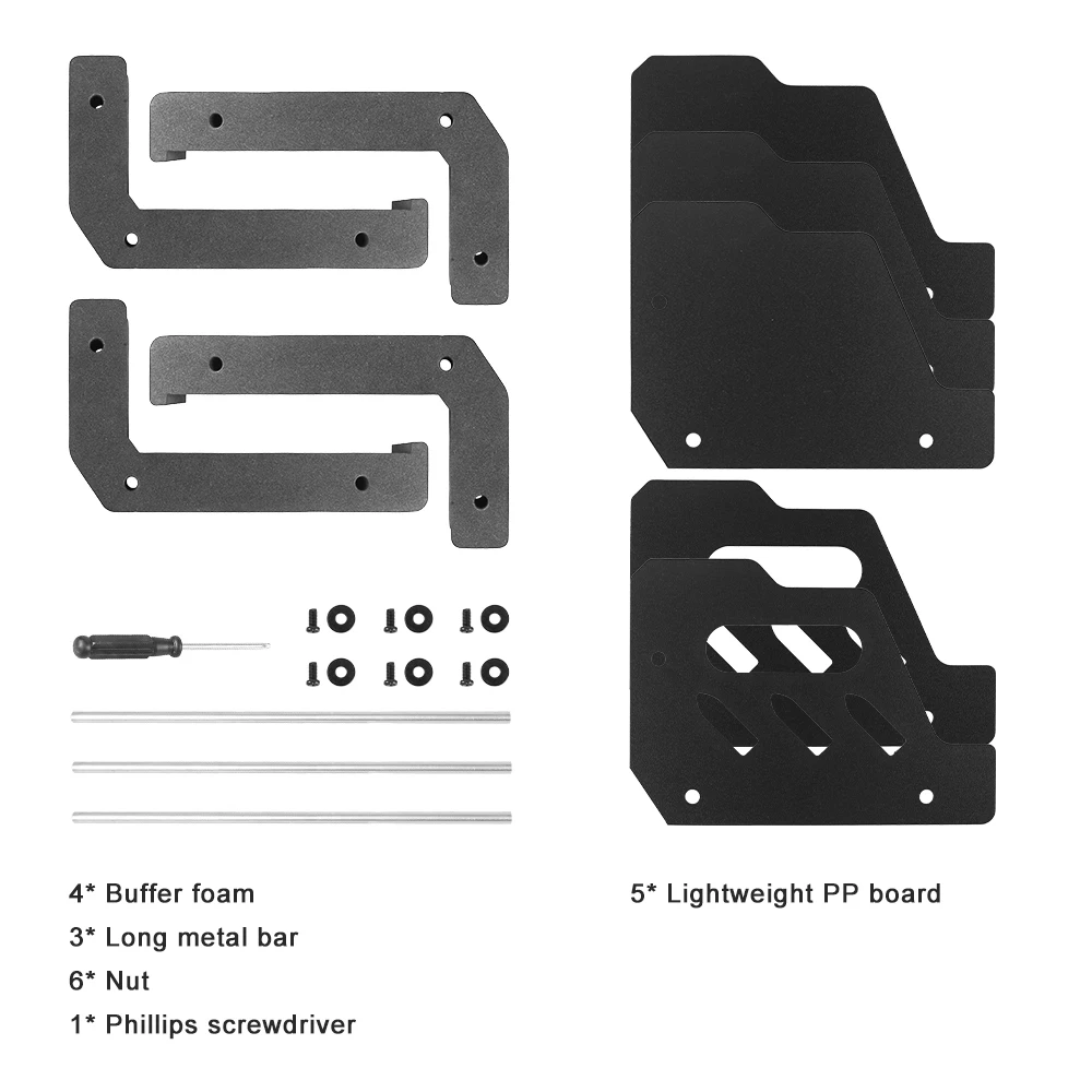 4Slots: 5 x lightweight PP board, 4 x cushion foam, 3 x long metal rod, 6 x nuts, 1 x phillips screwdriver