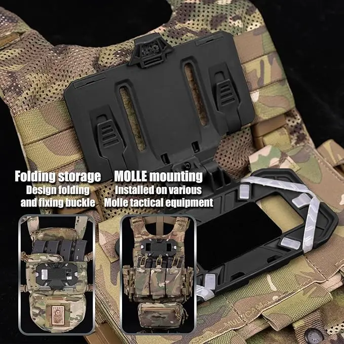 4.Soporte estilo chaleco: el soporte para placa telefónica se puede acoplar a un chaleco o mochila con correas MOLLE, lo que le brinda acceso rápido a su teléfono inteligente en todo momento.