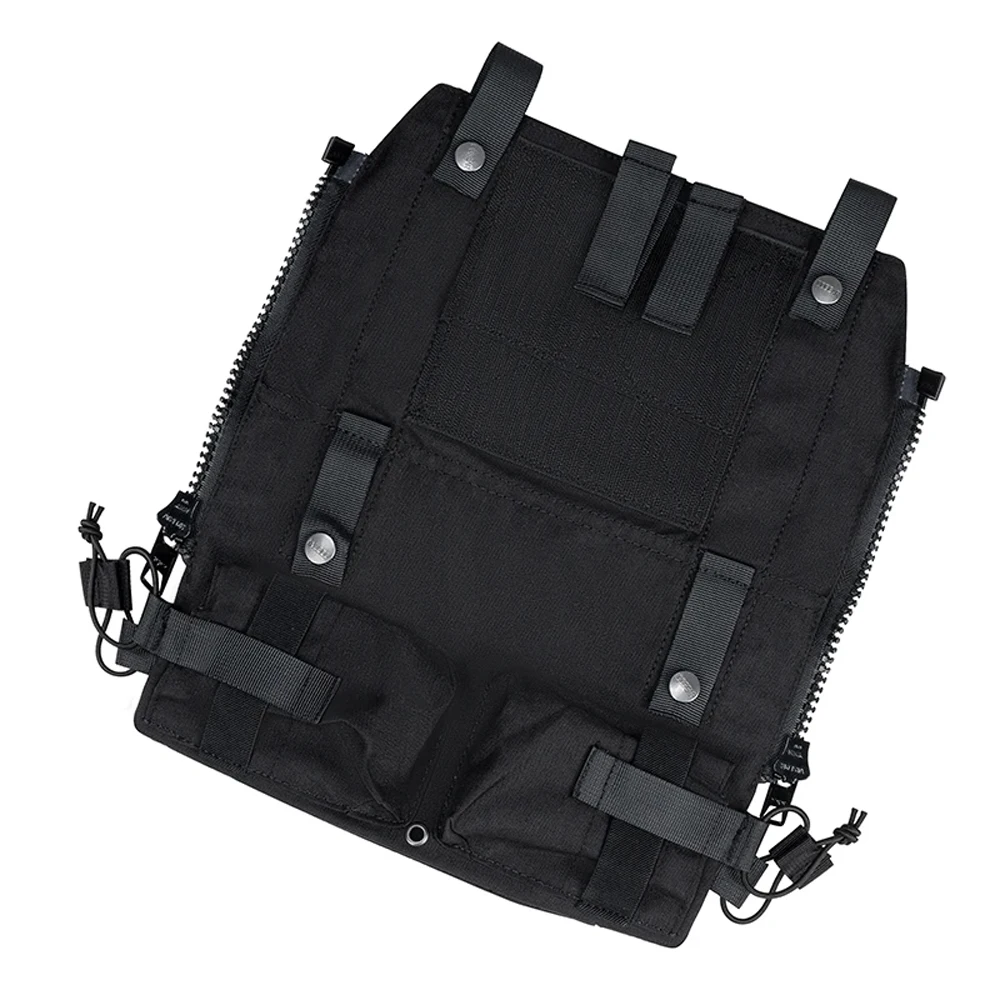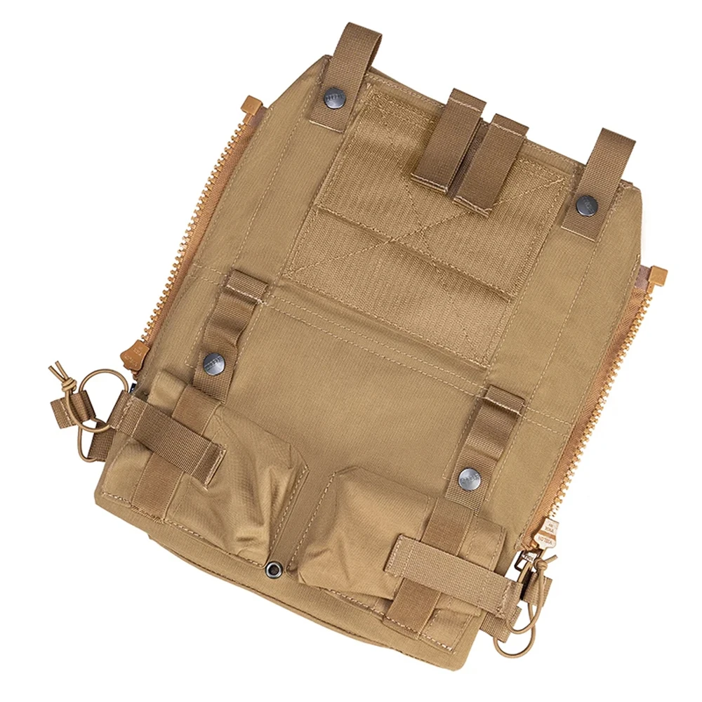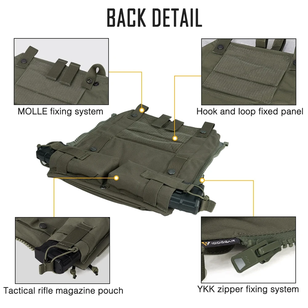 Se puede fijar a otro soporte de placa de chaleco mediante cremalleras y hebillas en la parte posterior.