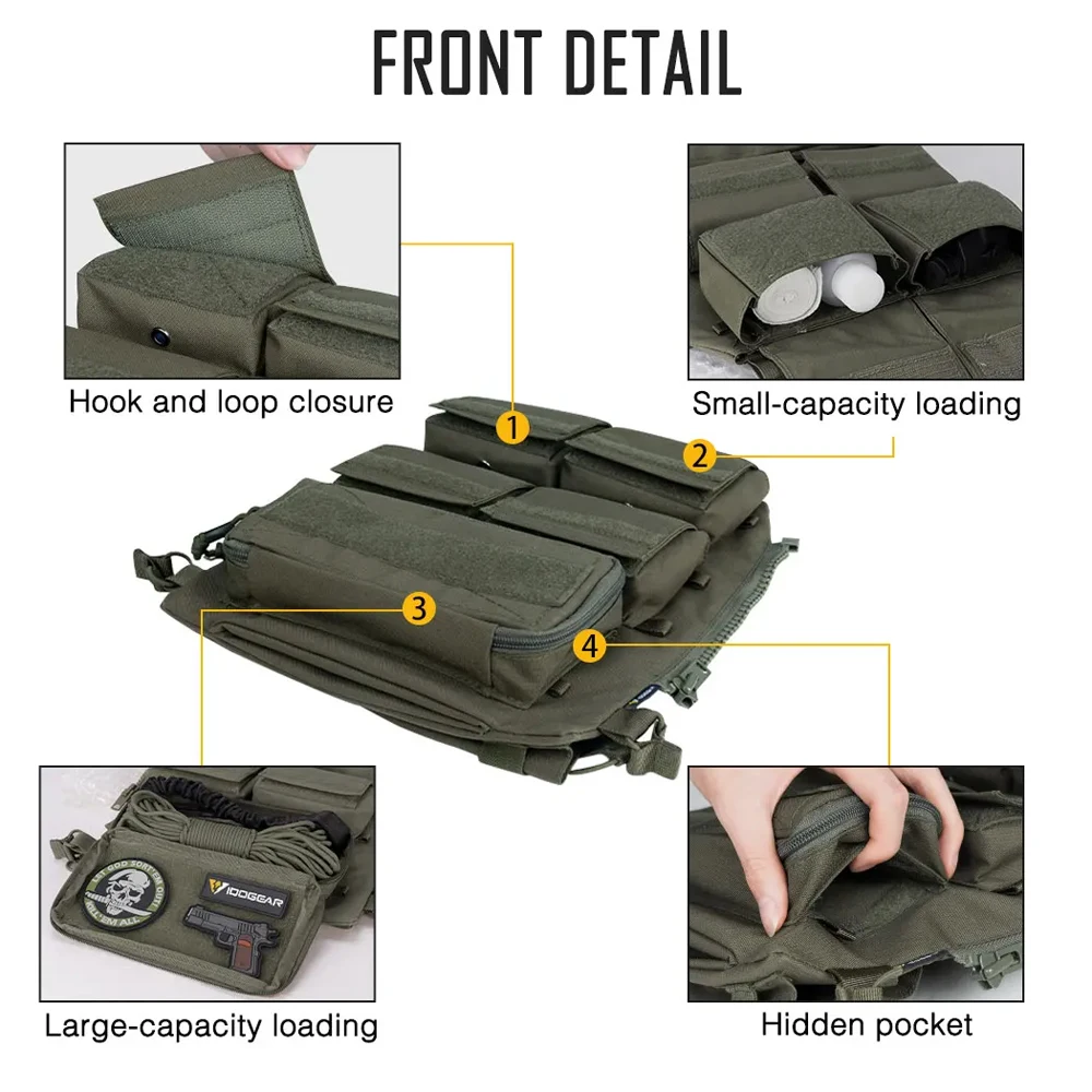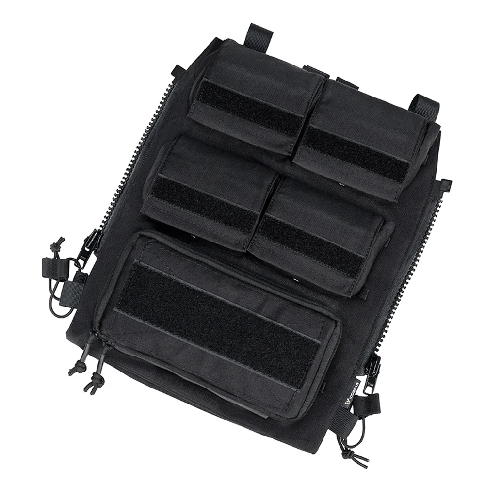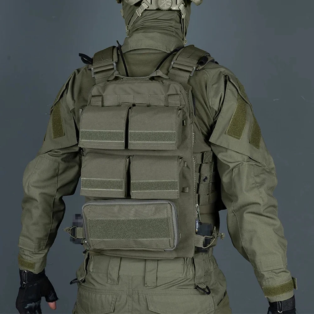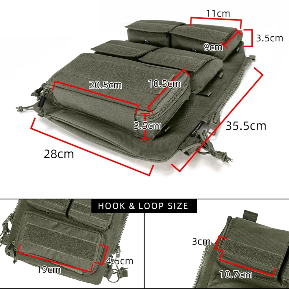 Se puede fijar a otro soporte de placa de chaleco mediante cremalleras y hebillas en la parte posterior.