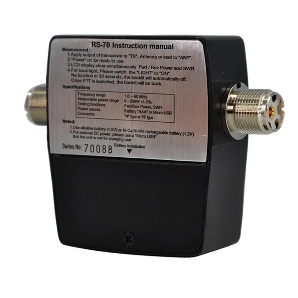 1. Aplique la salida del transceptor a "TX" y la antena o carga a "ANT".2."ENCENDIDO" listo para usar.3. La pantalla LCD muestra simultáneamente "Fwd/Rev Power y SWR".4. Para luz trasera=, cambia de "LUZ" a "ENCENDIDO".No hay función en 30 segundos, la retroiluminación se apagará automáticamente.Una vez que se inicie el PTT, la retroiluminación volverá.Instalación de la batería:1. Retire el tornillo negro de la cubierta para operar el panel trasero.2. Instale 2 pilas "AAA" de la piezas.3. Se puede utilizar con batería alcalina o Ni-ca,Ni-MH recargable.4. Esta unidad no tiene circuitos de carga incorporados.5. Asegúrese de corregir la polaridad de la batería.6. Retire la batería si la unidad no se utilizará durante un período prolongado.Nota:1. Se puede utilizar una batería alcalina (1,5 V) o una batería recargable (1,2 V).2. Esta unidad no tiene circuitos de carga incorporados.3. Asegúrese de apagar tanto "Encendido" como "Luz" después de usarlo para ahorrar batería.Cada paquete contiene:-1 medidor de potencia/SWR digital NISSEI-1 manual de usuario