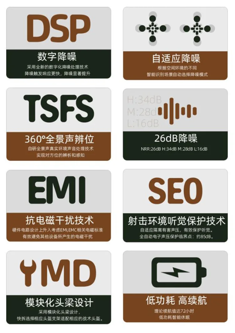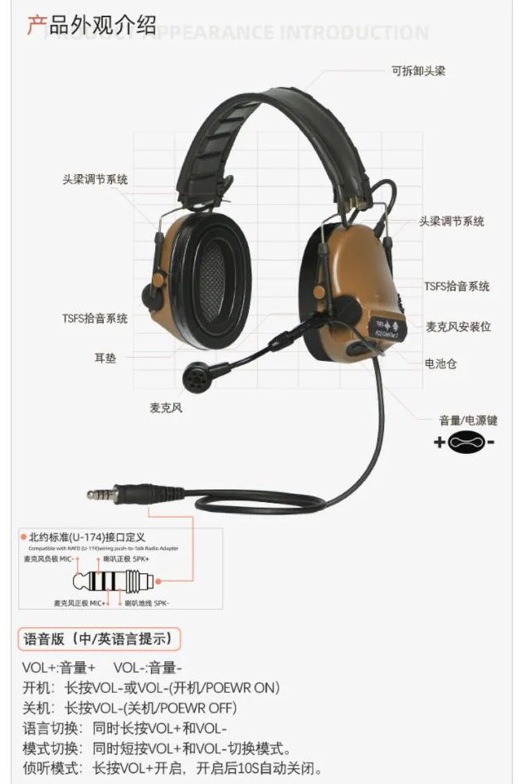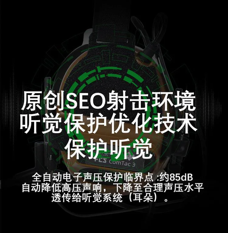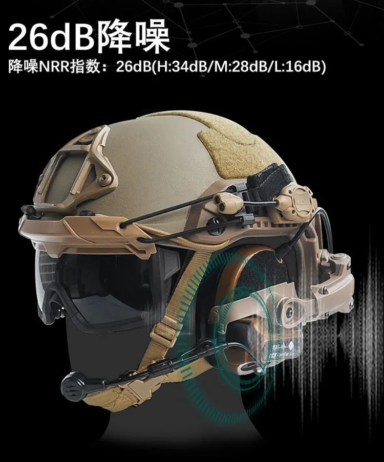 8. Con la función de filtrado inteligente de sonidos ambientales complejos, puede seleccionar de forma inteligente y automática los sonidos ambientales normales para ingresar al sistema auditivo del usuario. Evite cualquier bloqueo auditivo debido al sistema antirruido activo y mejore el estado de alerta y la capacidad de respuesta del usuario en cualquier entorno táctico debido al efecto mejorado del sonido.