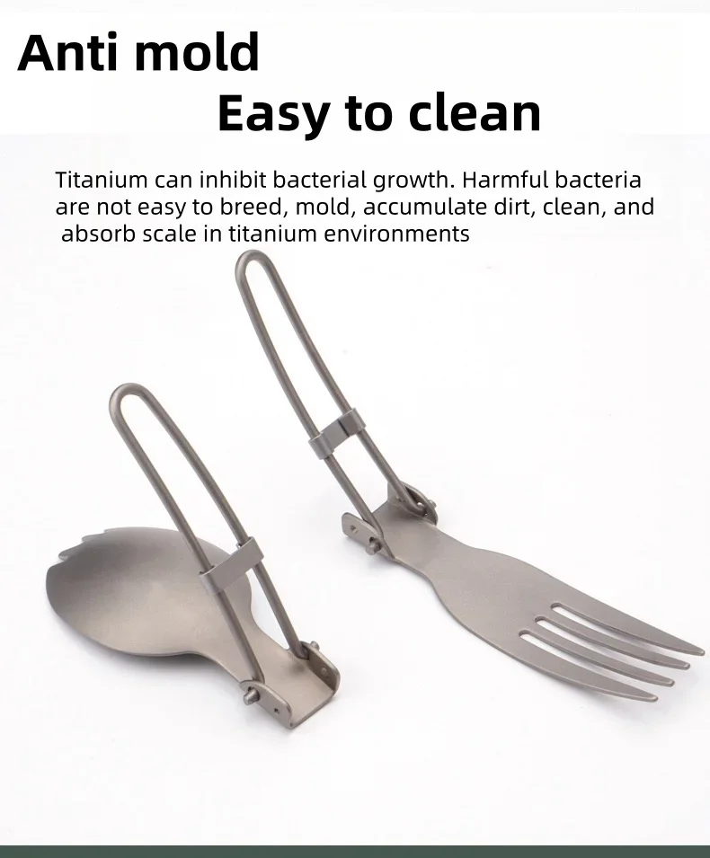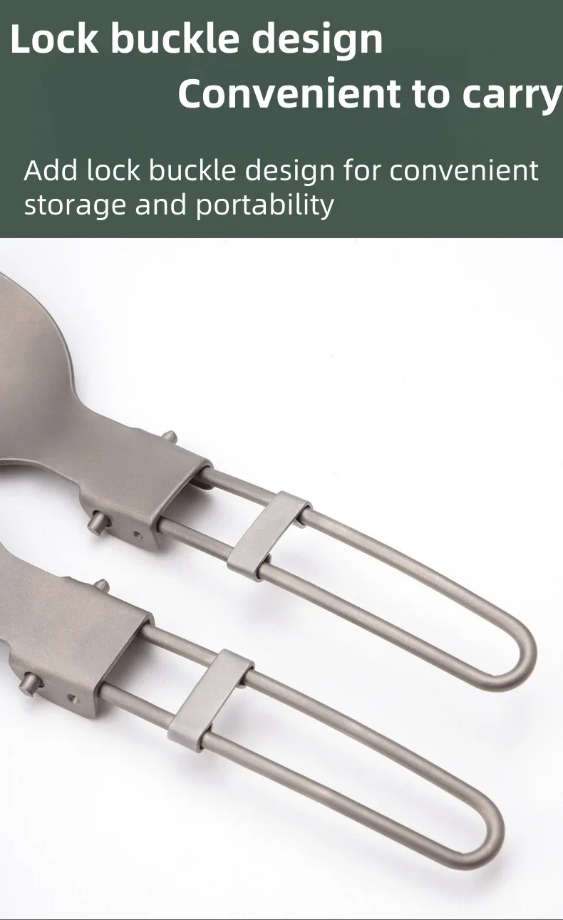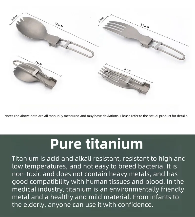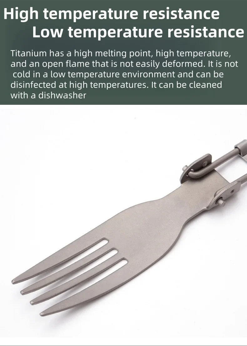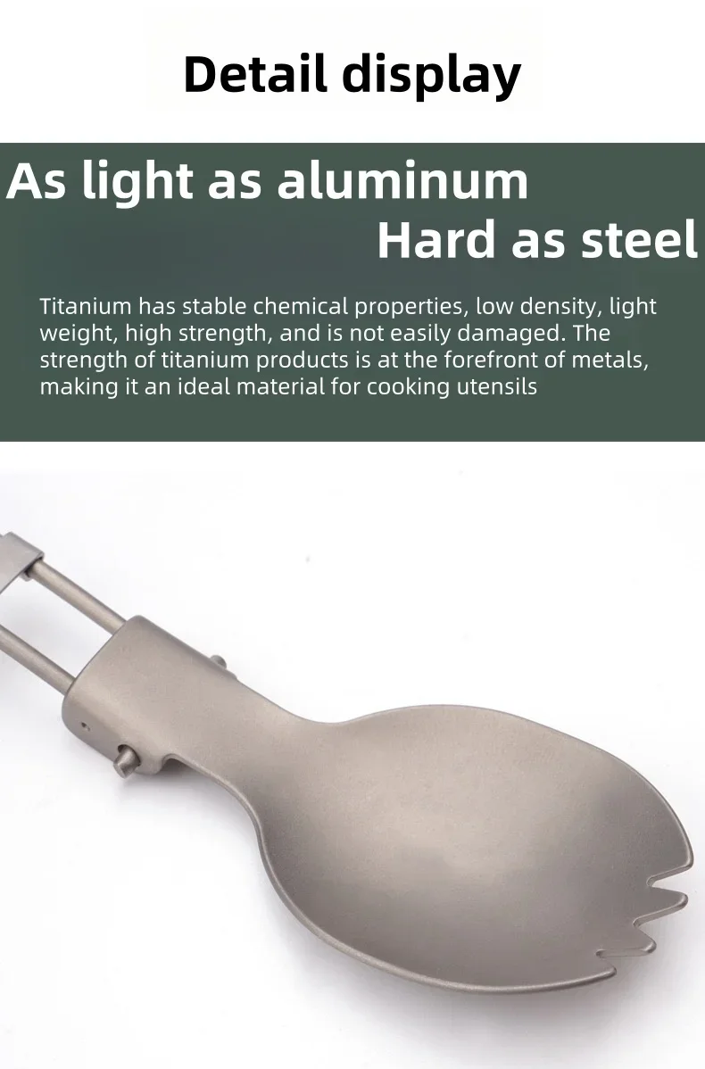 El cuerpo principal está hecho de material de titanio puro, que es liviano, duradero, decolorado y amigable con el cuerpo humano. El mango plegable y la cuchara en un diseño son más portátiles y prácticos. Una elección de moda para vajillas de exterior.