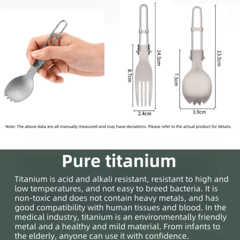 El cuerpo principal está hecho de material de titanio puro, que es liviano, duradero, decolorado y amigable con el cuerpo humano. El mango plegable y la cuchara en un diseño son más portátiles y prácticos. Una elección de moda para vajillas de exterior.
