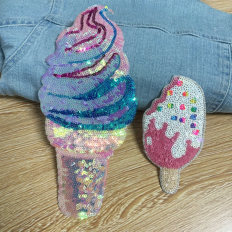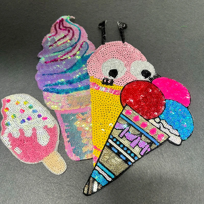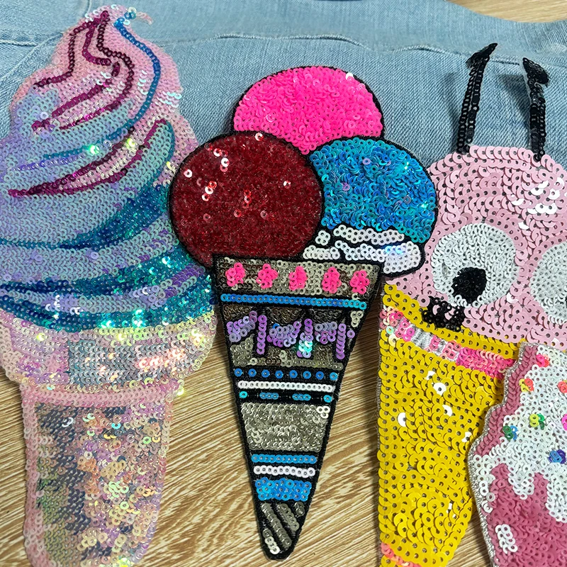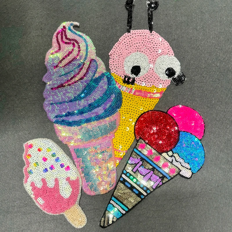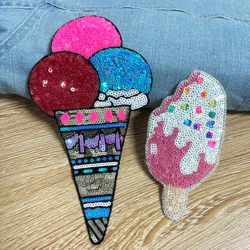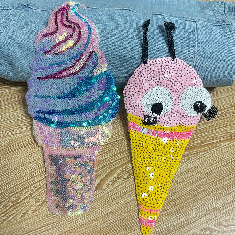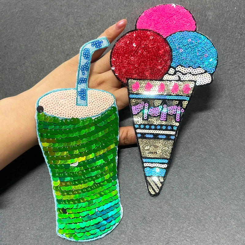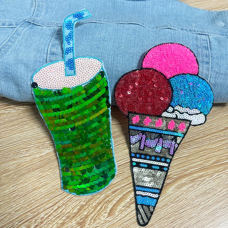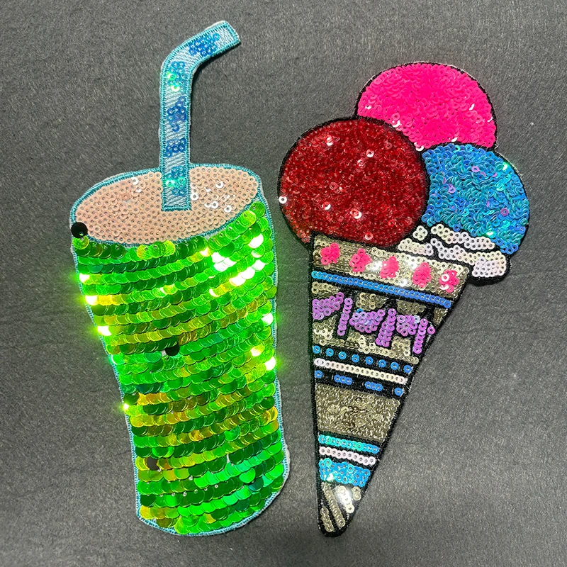 Nuevos parches bordados de lentejuelas de dibujos animados DIY lentejuelas coloridas helado bebidas parche decoración de ropa bordado pegatinas para coser