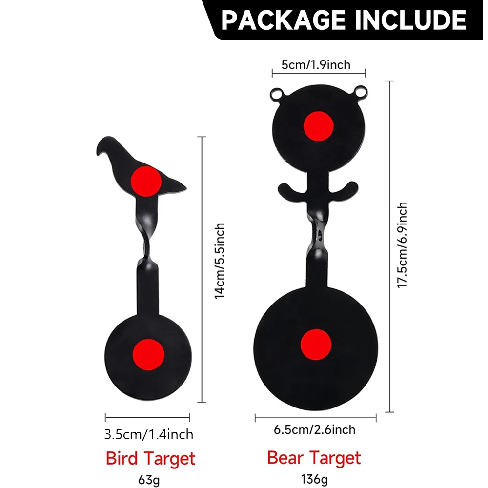 1.[DISEÑO CREATIVO]: Nuevo oso, objetivos giratorios en forma de pájaro, que miden 6,5 cm/2,6", 3,5 cm/1,4" respectivamente.Estos objetivos de acero son perfectos para practicar y concursos.El centro objetivo es muy visible, lo que mejora la precisión del disparo.