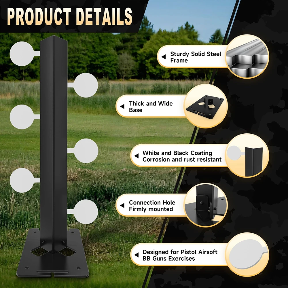 (2) El marco objetivo de la pistola de reinicio consta de la columna principal y 6 objetivos de tiro de acero al carbono con un diámetro de 2" (5 cm).Los objetivos de tiro con bases totalmente metálicas crean sistemas de objetivos muy resistentes y duraderos que pueden soportar innumerables entrenamientos.