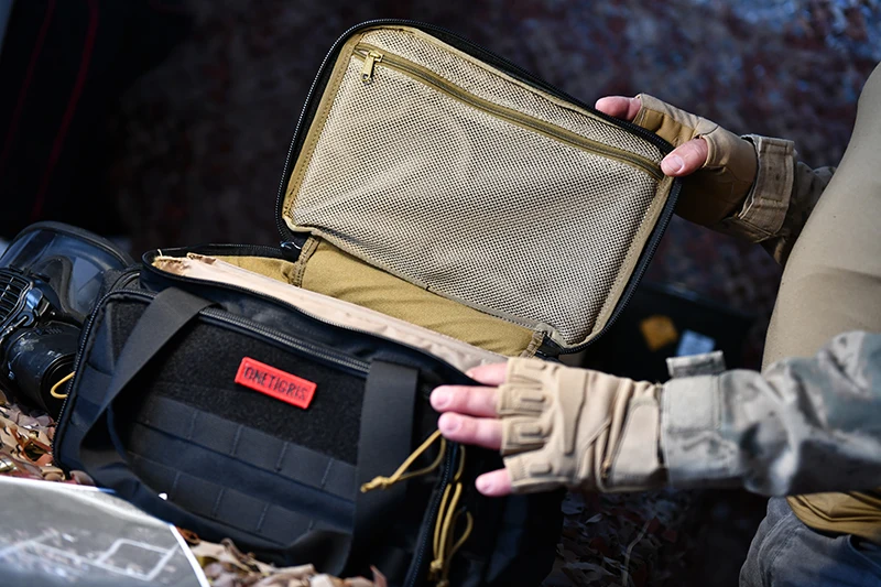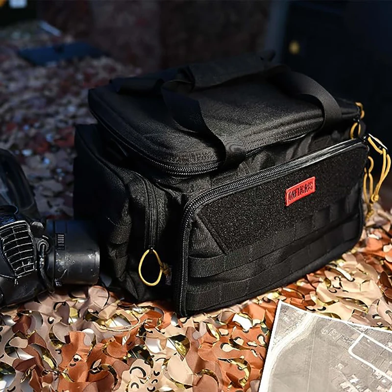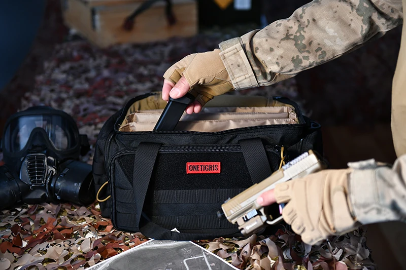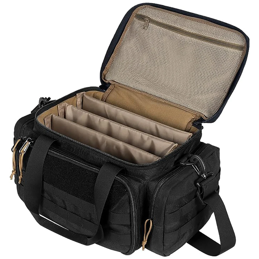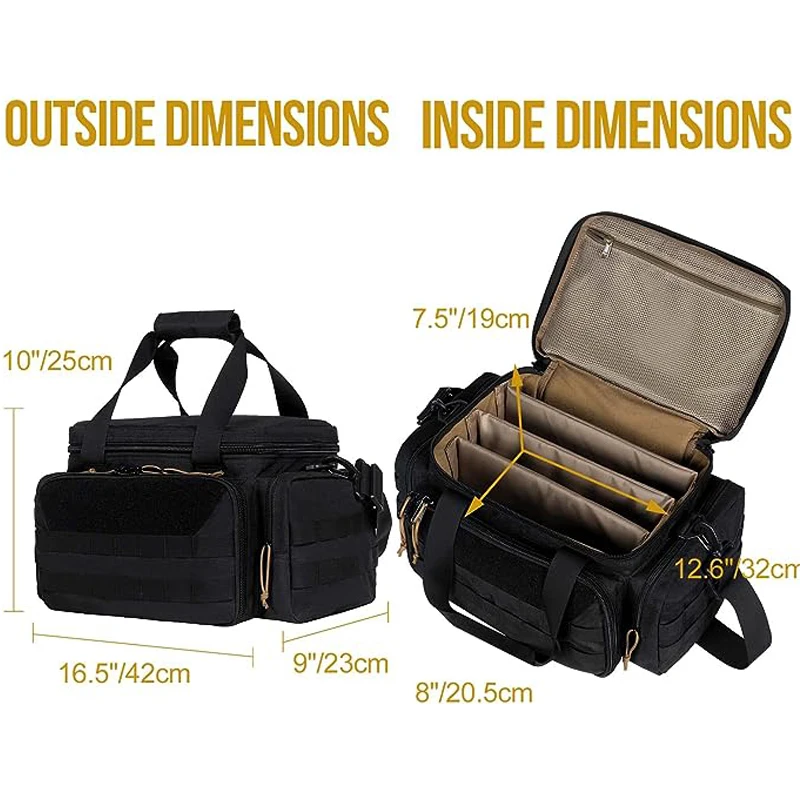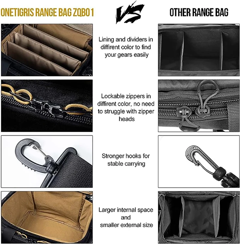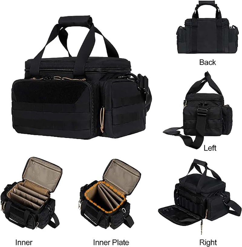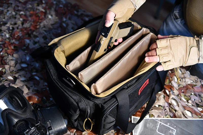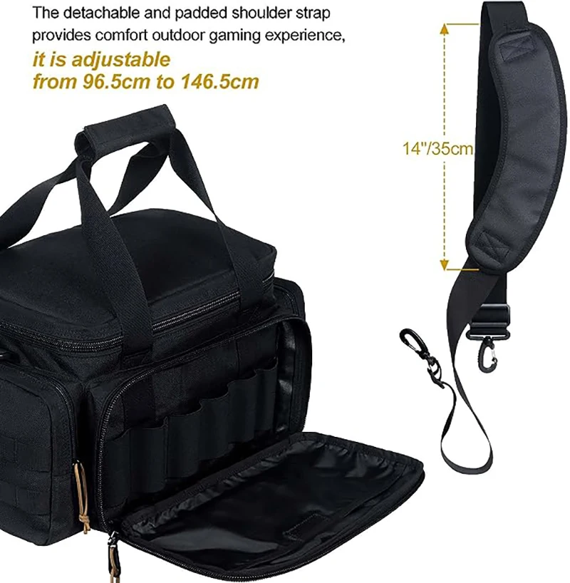 Función: la bolsa del campo de tiro tiene múltiples compartimentos acolchados para mantener sus pistolas, orejeras, gafas, revistas, municiones y accesorios, etc. de forma segura y resistente a los arañazos.