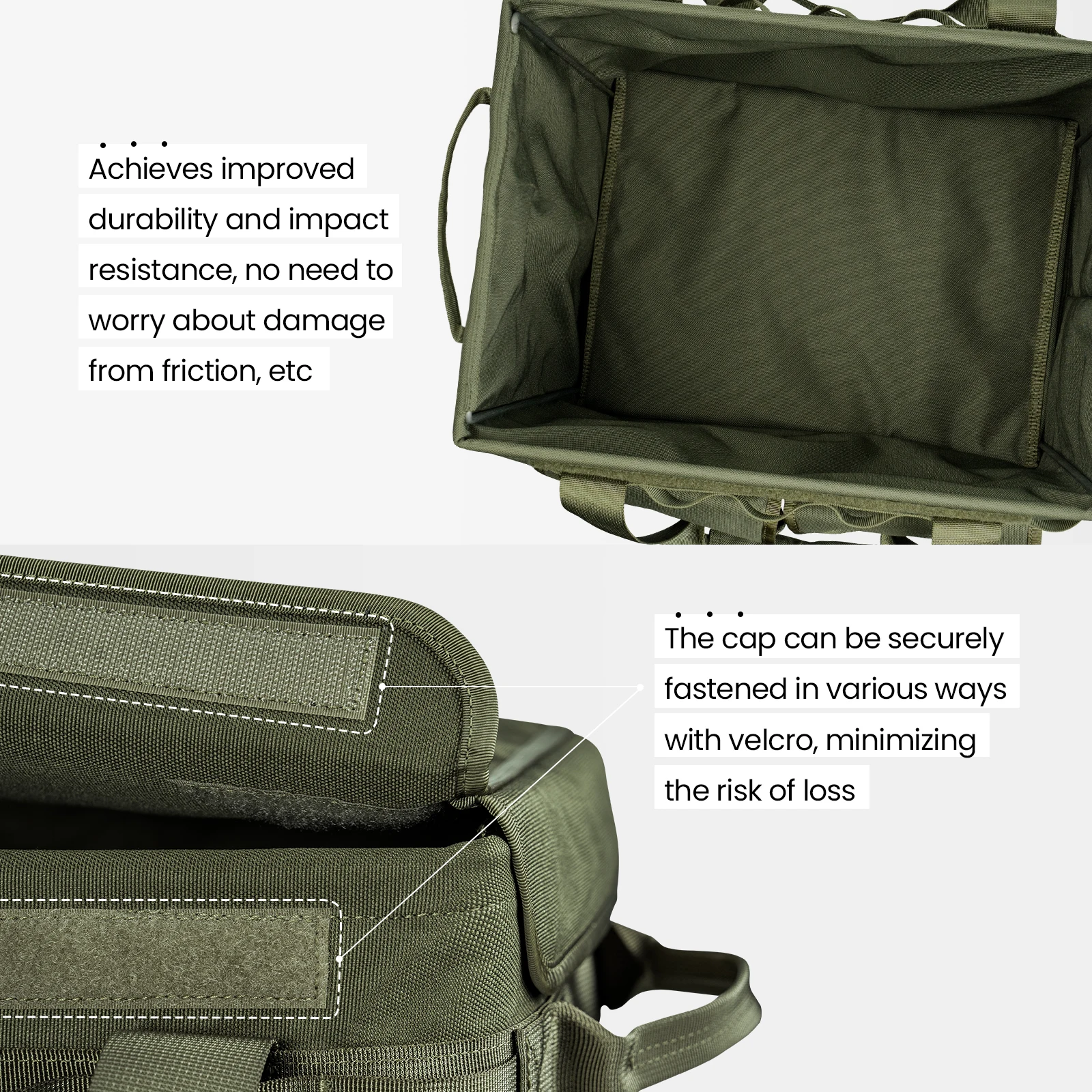 El tejido de poliéster 1000D tiene un acabado repelente al agua, pero no es 100% impermeable. Tenga especial cuidado al almacenar artículos tecnológicos/delicados.