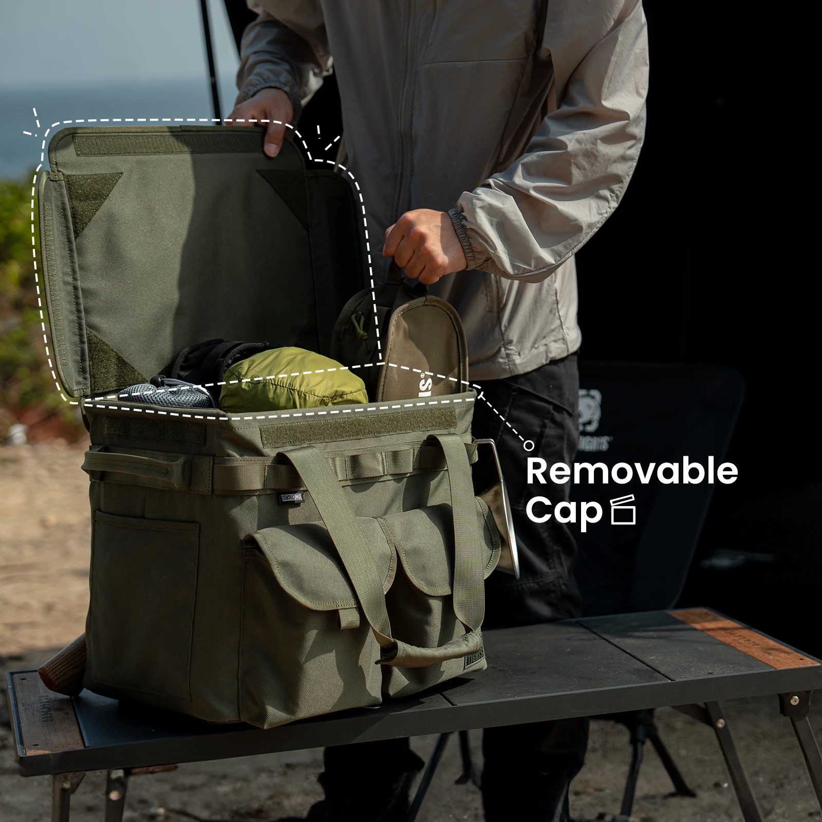 Esta bolsa plegable para acampar se convertirá en uno de tus equipos para ir al aire libre. Aproximadamente 14 "por 9,4" por 13 "de tamaño, encaja perfectamente en el maletero de su automóvil para mantener todas sus herramientas y equipo organizados, y después de haber llegado al campamento, se puede utilizar para transportar, organizar y almacenar todo, desde equipo de camping hasta utensilios de cocina, comida y ropa, Y también es increíble para llevar comestibles, herramientas de jardinería, etc. Cuando no está en uso, se puede comprimir en altura y apilar ordenadamente en el garaje, y el uso de tela de nailon resistente significa que resistirá el uso pesado a largo plazo. El moldura MOLLE se puede utilizar para atar herramientas o para colgar artículos como luces de campamento, tazas de camping y linternas, Y en la parte trasera encontrará un soporte de hacha especialmente diseñado con una correa de velcro para mantenerlo en su lugar. Las posibilidades son infinitas con este diseño táctico.