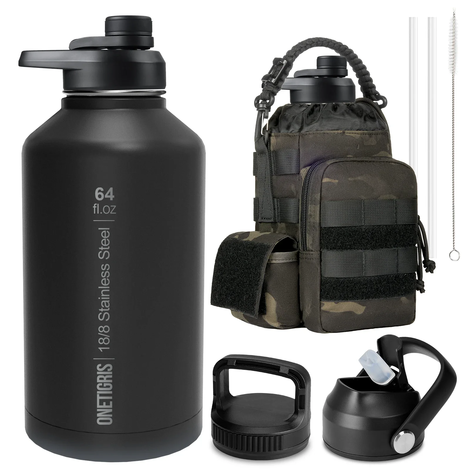 ONETIGRIS Botella de agua táctica de medio galón con pajita - Jarra de agua de acero inoxidable con aislamiento al vacío de 64 oz Botella deportiva a prueba de fugas