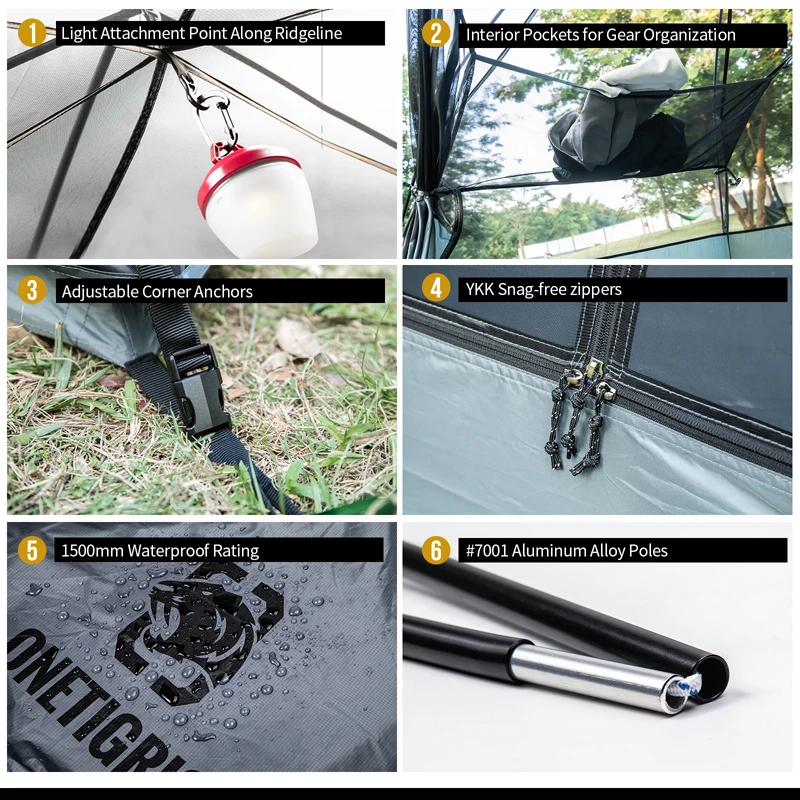 Material: Tienda exterior de poliéster a cuadros 20D, Fondo de tienda de nailon 70D, tienda interior de malla de nailon 40D, cremalleras YKK®, postes de tienda de aleación de aluminio #7001