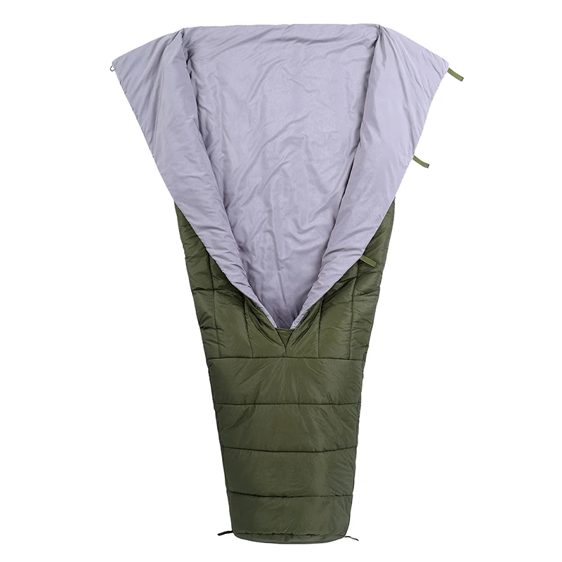 Different from traditional sleeping bags, this top quilt forms a diamond shaped gap for use with waterproof mats or air mattresses.