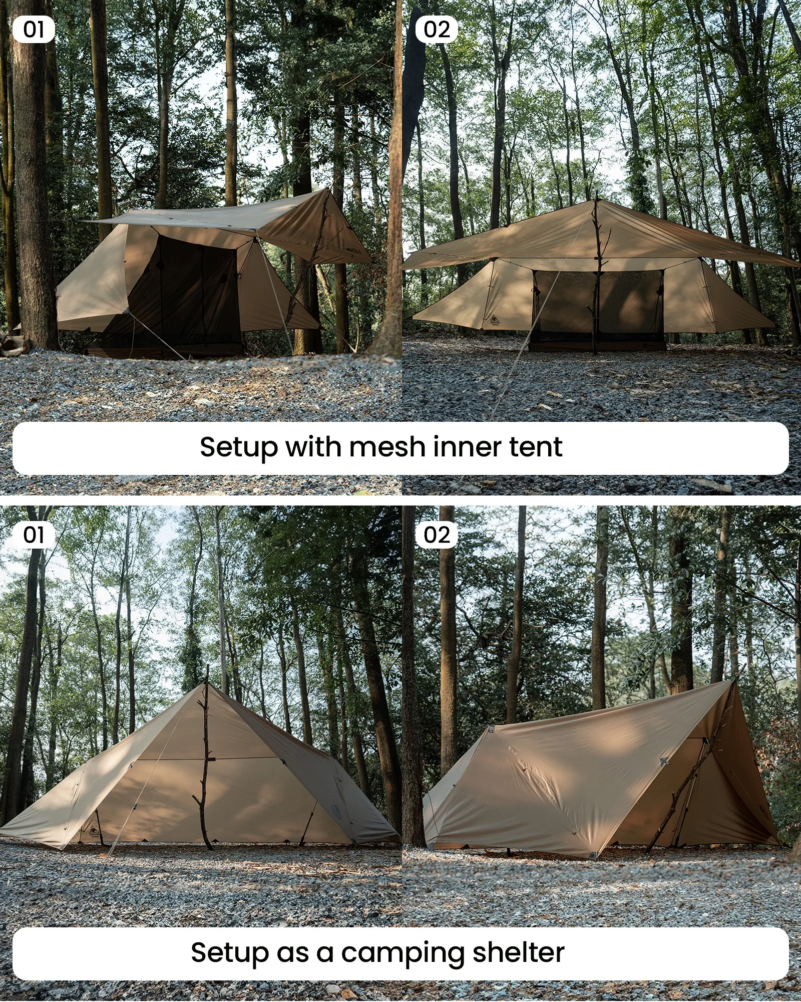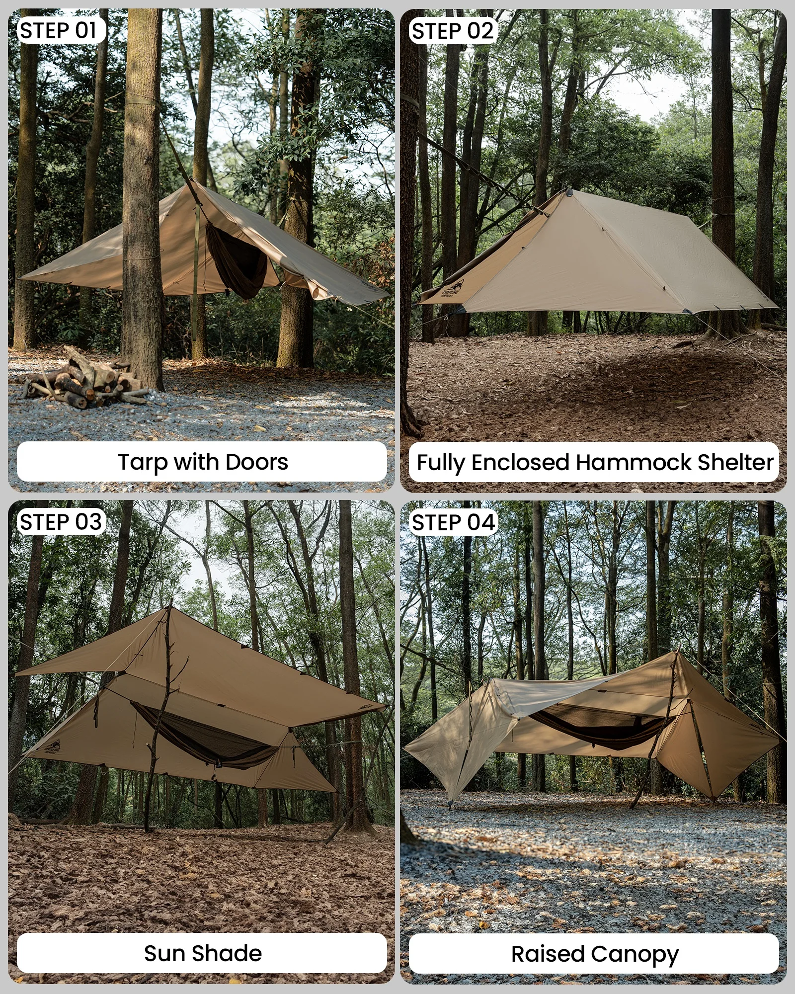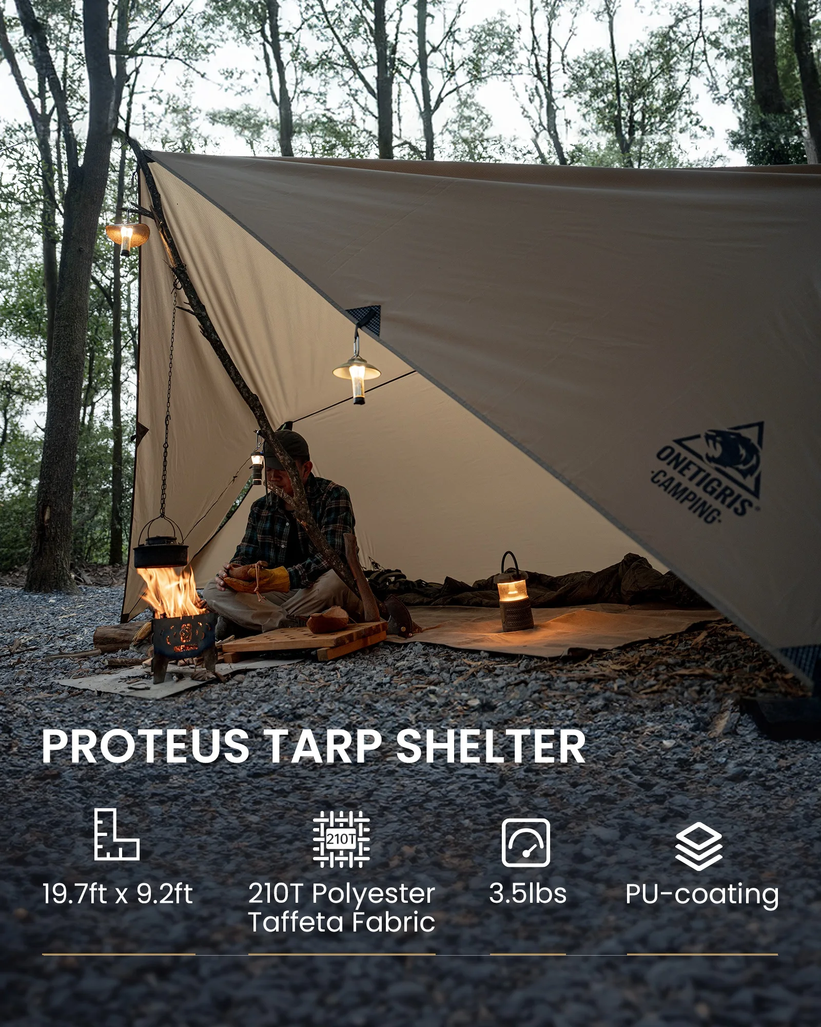 El nombre del antiguo guardián griego de las bestias marinas, famoso por su capacidad para cambiar de forma, la PROTEUS es una lona multifuncional que se puede utilizar en una variedad de paisajes con sus 21 puntos de amarre y su forma única. Si bien las lonas más comunes son rectangulares o en forma de mariposa, no ofrecen protección completa contra los elementos, mientras que el PROTEUS tiene dos solapas triangulares en cada lado que se superponen para formar una barrera sólida en todos los lados, ideal para usar con todo tipo de hamacas con su línea de cresta de 10,5 pies de largo. Fabricado con tafetán de poliéster con una capa de recubrimiento de PU, El PROTEUS ofrece una protección impermeable de 2000mm, resistencia al desgarro, retención de forma y secado rápido para un uso conveniente. Los campistas también pueden usar el PROTEUS con carpas de malla para protección contra los rayos UV y la lluvia mientras disfrutan de un buen flujo de aire, o considerar usar la lona sola como un refugio al aire libre rápido y simple. Tenga en cuenta que este producto no viene con postes de tienda de campaña, pero incluye un kit de instalación de estacas, líneas de sujeción y un saco de cosas.