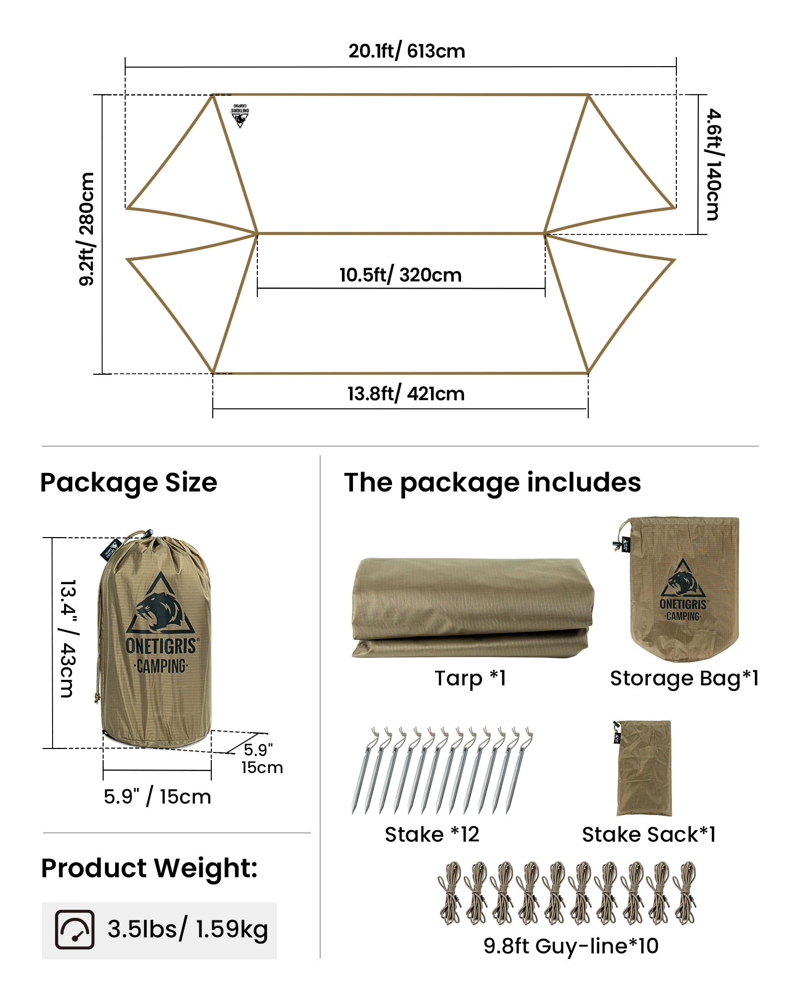 | EL PRODUCTO INCLUYE: La lona viene con 12 estacas, diez cables de 9,8 pies y un saco resistente para facilitar el transporte (el producto NO incluye postes de tienda)