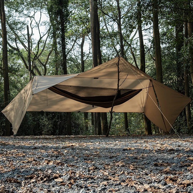 El nombre del antiguo guardián griego de las bestias marinas, famoso por su capacidad para cambiar de forma, la PROTEUS es una lona multifuncional que se puede utilizar en una variedad de paisajes con sus 21 puntos de amarre y su forma única. Si bien las lonas más comunes son rectangulares o en forma de mariposa, no ofrecen protección completa contra los elementos, mientras que el PROTEUS tiene dos solapas triangulares en cada lado que se superponen para formar una barrera sólida en todos los lados, ideal para usar con todo tipo de hamacas con su línea de cresta de 10,5 pies de largo. Fabricado con tafetán de poliéster con una capa de recubrimiento de PU, El PROTEUS ofrece una protección impermeable de 2000mm, resistencia al desgarro, retención de forma y secado rápido para un uso conveniente. Los campistas también pueden usar el PROTEUS con carpas de malla para protección contra los rayos UV y la lluvia mientras disfrutan de un buen flujo de aire, o considerar usar la lona sola como un refugio al aire libre rápido y simple. Tenga en cuenta que este producto no viene con postes de tienda de campaña, pero incluye un kit de instalación de estacas, líneas de sujeción y un saco de cosas.