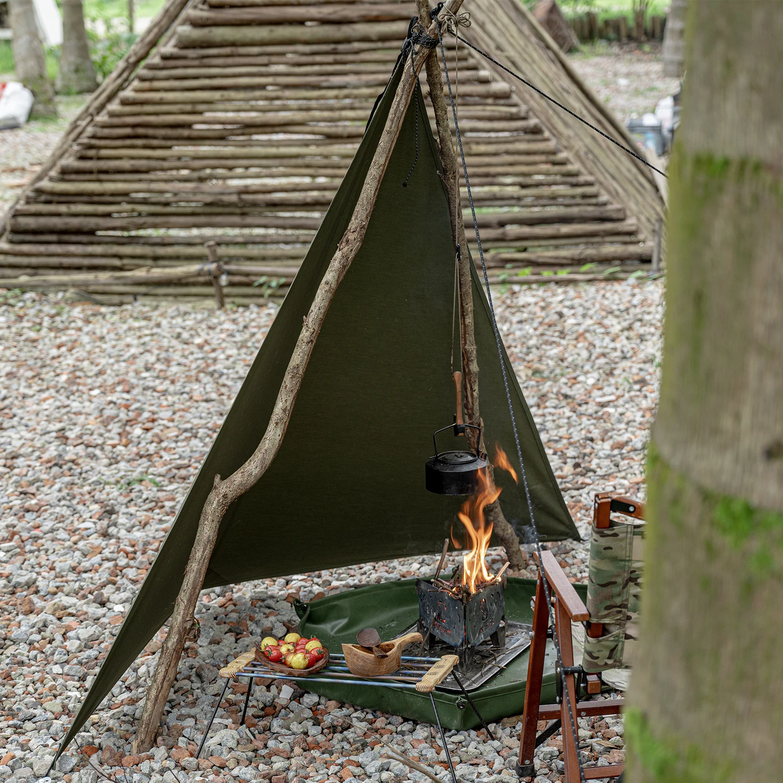 | Para uso en invierno, esta lona puede ayudar a crear un espacio de acampada al aire libre completamente cerrado cuando se conecta con el ROCK SHIELD T/C Bushcraft Shelter o similar, para usar con una estufa ardiente para mantenerse caliente y acogedor