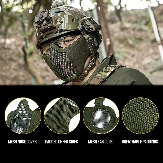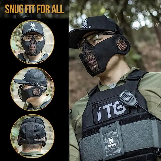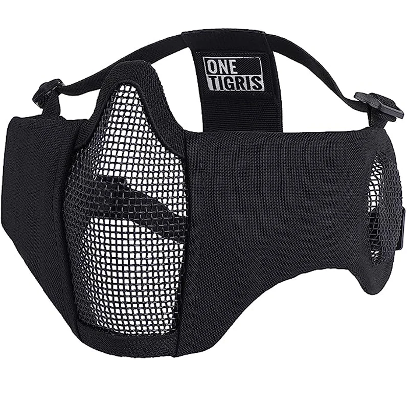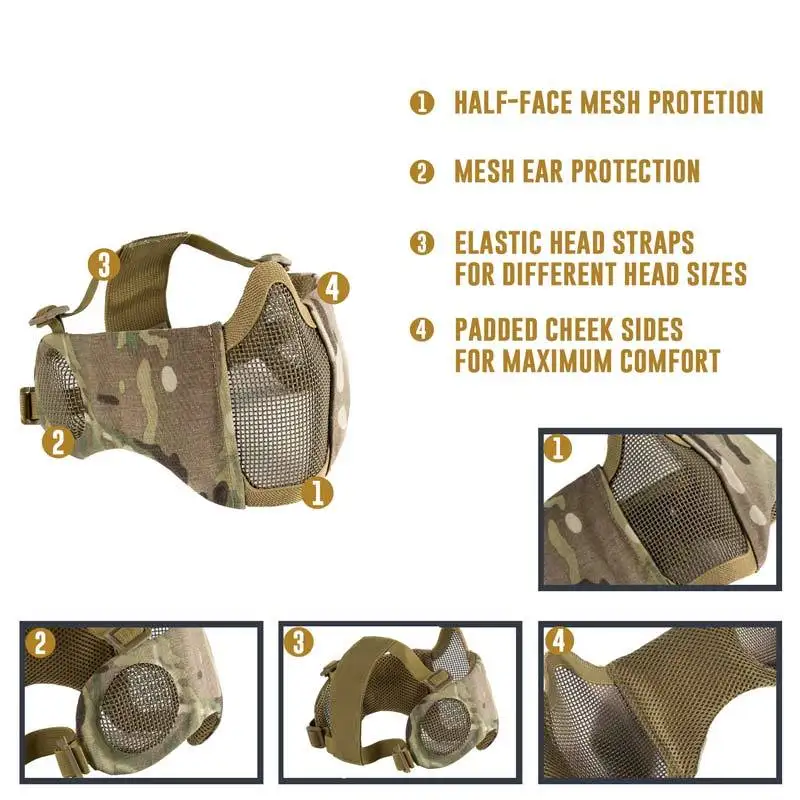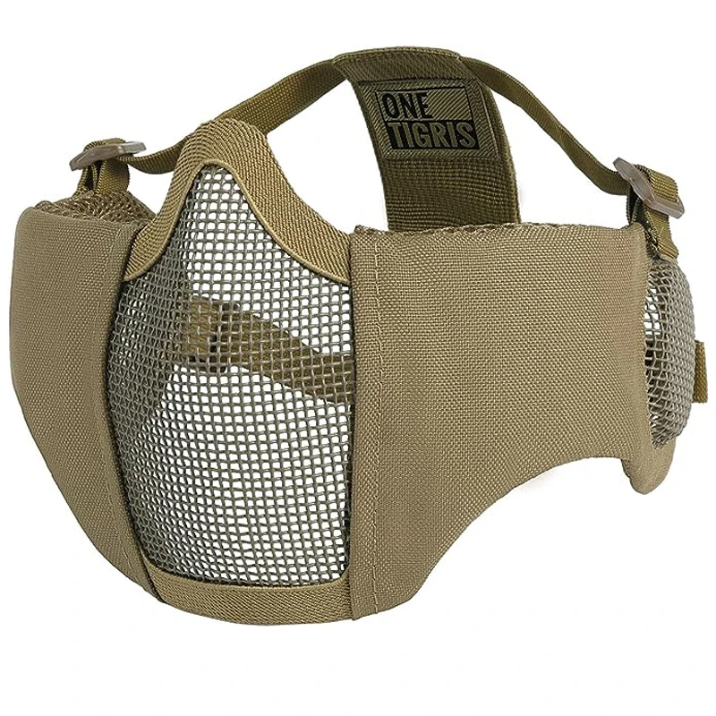 ¿Por qué elegir la máscara de malla plegable OneTigris?Otra de nuestras mascarillas de malla de media cara de la serie Airsoft que ofrece una excelente ventilación y protección durante el juego, solo que esta tiene protección auditiva adicional diseñada para batallas cercanas. Probada a 800FPS resistencia al impacto, esta máscara de malla es el tipo en el que confiar para los próximos Juegos.Máscara de malla plegable con protección para los oídos1. Máscara de malla Airsoft ligera, plegable y portátil2. Nylon 1000D para mayor durabilidad y buena resistencia al agua/suciedad3. Protector auditivo de malla con correas ajustables para batallas cercanas4. Lados de la mejilla de tela acolchada suave para con protección para el puente de la nariz que ofrece comodidad y buena protección5. Sin puntos de presión en la cara del usuario para una respiración fácil y una buena ventilación6. Soporte de correa doble con banda de gorro de calavera para un ajuste cómodo para diferentes tamaños de cabeza7. Probado a 800FPS resistencia al impacto a una temperatura de-10 °C a 42 °C.Puntas1. Recomendado para adolescentes mayores y adultos2. Ajusta las correas para que sea cómodo y seguro.El paquete incluyeMáscara de malla táctica plegable de media cara * 1EspecificacionesMaterial: acero, nailonPeso: 5,29 oz/150gDimensiones: 7,8 "* 6"/20cm * 15cm