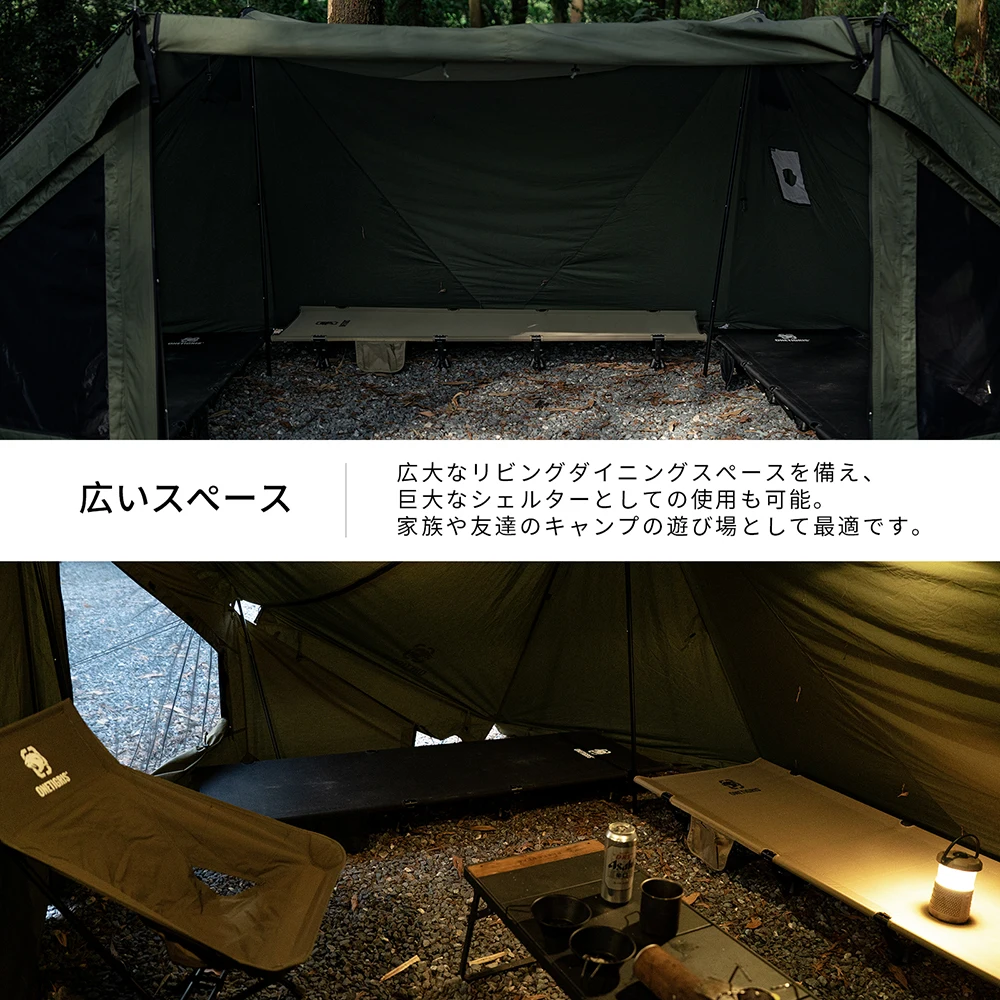 | Para uso en invierno, esta lona puede ayudar a crear un espacio de campamento al aire libre completamente cerrado cuando se conecta con el Refugio ROC SHIELD T/C Bushcraft, para usar con una estufa ardiente para mantenerse caliente y acogedor