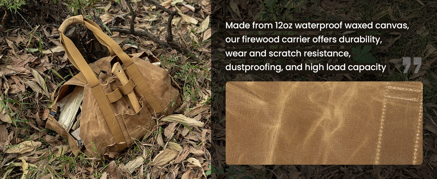 Lona encerada de alta calidad y asas duraderas: el soporte para leña OneTigris está hecho de lona encerada impermeable de 12 oz, que ofrece una excelente resistencia al desgaste, a prueba de polvo, resistencia a los arañazos y una gran capacidad de carga para un uso duradero. Las propiedades impermeables del lienzo encerado lo hacen ideal para ambientes húmedos o nevados, protegiendo eficazmente la leña para que no se moje, brindándole tranquilidad. El diseño del mango acolchado que alivia la presión garantiza un agarre cómodo, lo que facilita el transporte de troncos pesados con menos esfuerzo, lo que hace que este transportista sea su compañero confiable al aire libre.