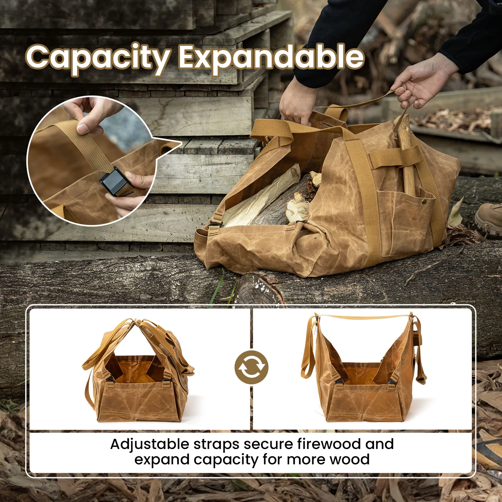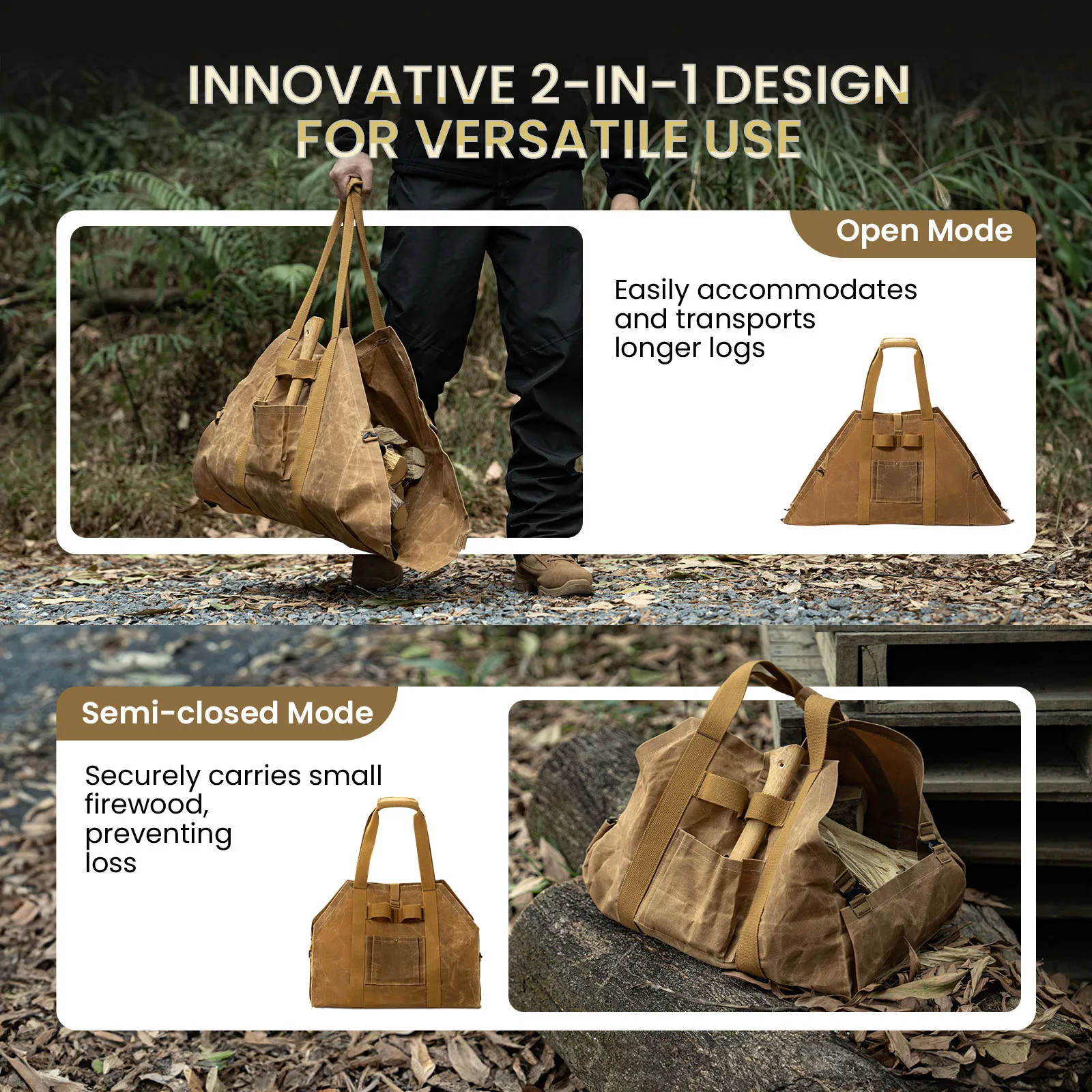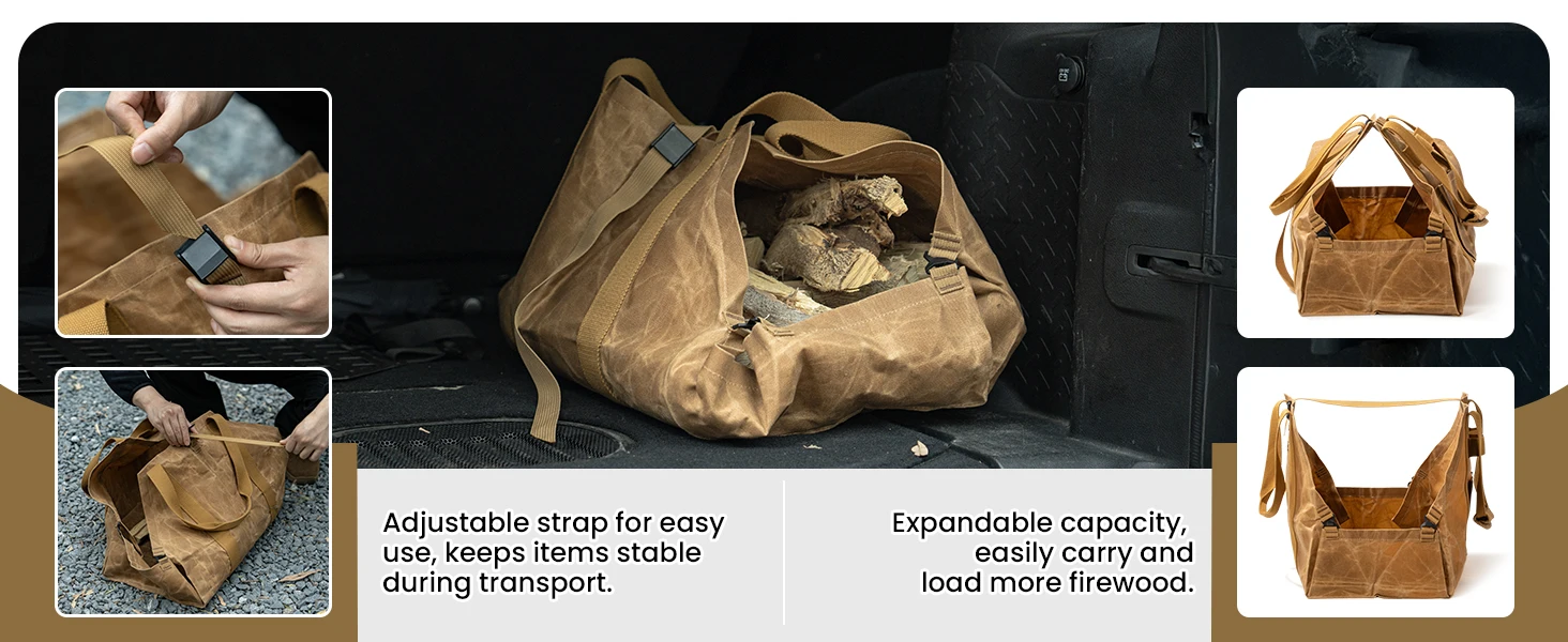 Innovador diseño 2 en 1 para un uso versátil: el porta leña OneTigris ofrece un diseño único 2 en 1 con hebillas resistentes, lo que le permite cambiar fácilmente entre una bolsa cerrada y abierta.El modo cerrado es ideal para transportar leña pequeña, mientras que el modo abierto puede acomodar troncos más largos, proporcionando flexibilidad ilimitada para satisfacer sus necesidades.