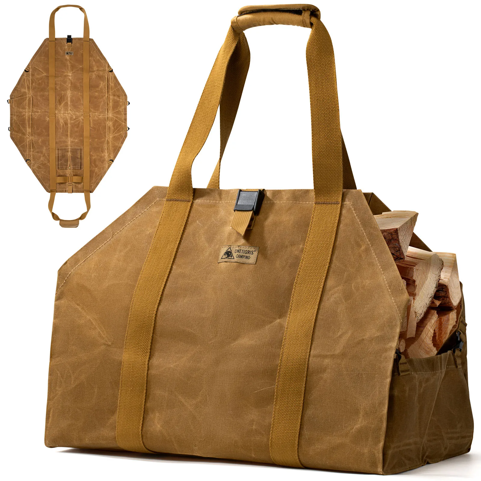 Porta leña OneTigris, bolsa porta leña 2 en 1, porta leña, porta leña de lona encerado, porta leña extra grandes con asas para fogón, camping, estufa de leña, barbacoa