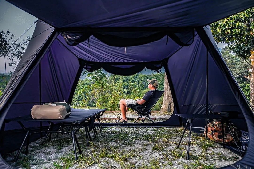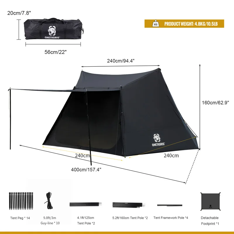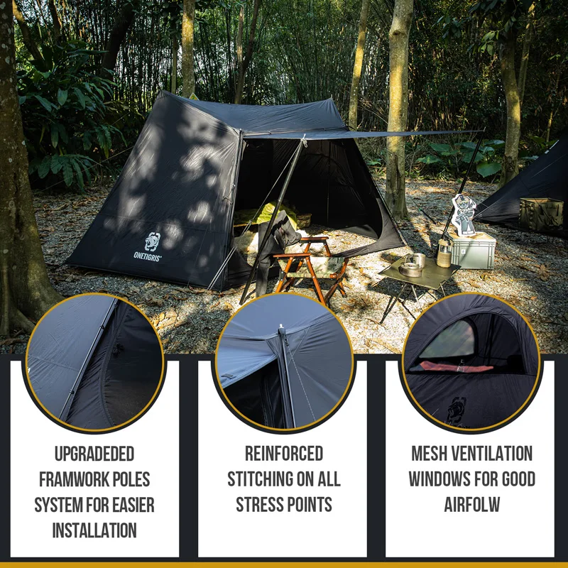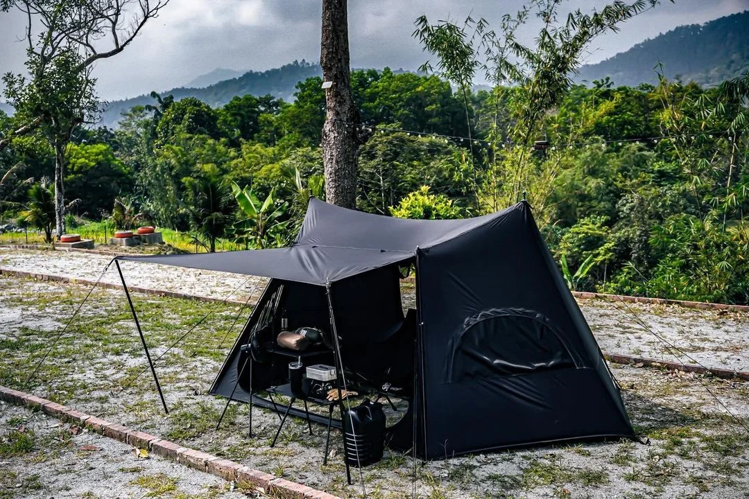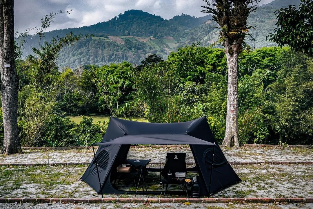 One of the gems of the Black Tigris Series, the NEBULA is the sturdiest of them all, with its unique double-peaked design and carbon black aesthetics. Its unique structure enables heightened wind-resistance and stability, making it a great choice for road trips and motorbike trips when you have to stay prepared for all kinds of weather conditions, not to mention it offers a front porch setup for you to use with your camping chairs to soak in the great wild.