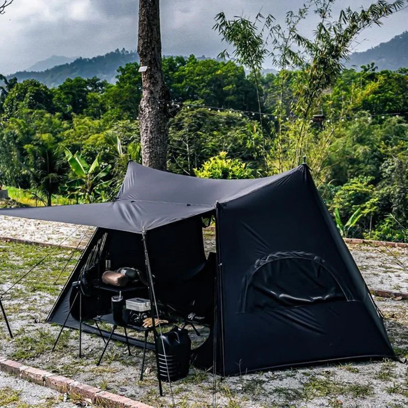 One of the gems of the Black Tigris Series, the NEBULA is the sturdiest of them all, with its unique double-peaked design and carbon black aesthetics. Its unique structure enables heightened wind-resistance and stability, making it a great choice for road trips and motorbike trips when you have to stay prepared for all kinds of weather conditions, not to mention it offers a front porch setup for you to use with your camping chairs to soak in the great wild.