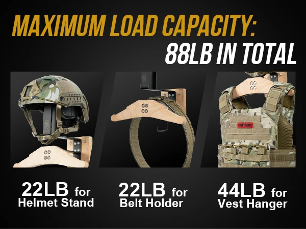 Capacidad de carga para alta resistencia: el soporte de pared para equipo táctico OneTigris puede soportar hasta 88 libras, lo que lo convierte en una solución de almacenamiento resistente y confiable para su equipo táctico.Tiene una capacidad de soporte para casco de 22 libras, una capacidad de soporte para chaleco de 44 libras y una capacidad de soporte para cinturones de 22 libras, lo que garantiza que su equipo esté seguro y protegido.